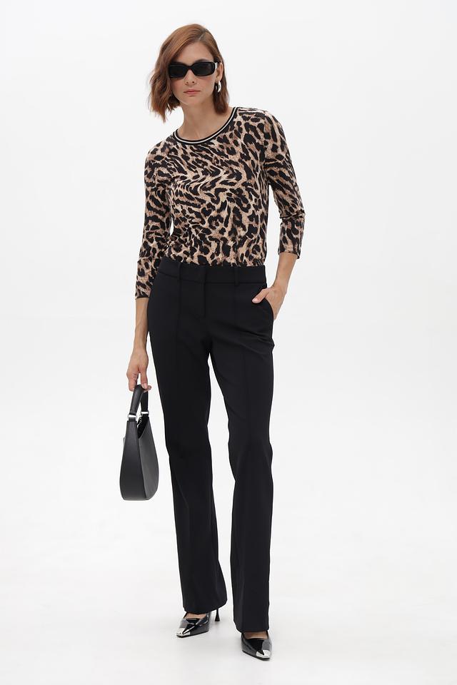 Брюки имеют стандартную застёжку на молнию и пуговицу, а также боковые карманы для удобства. Крой клёш добавляет образу женственности и позволяет создавать различные стильные комбинации.