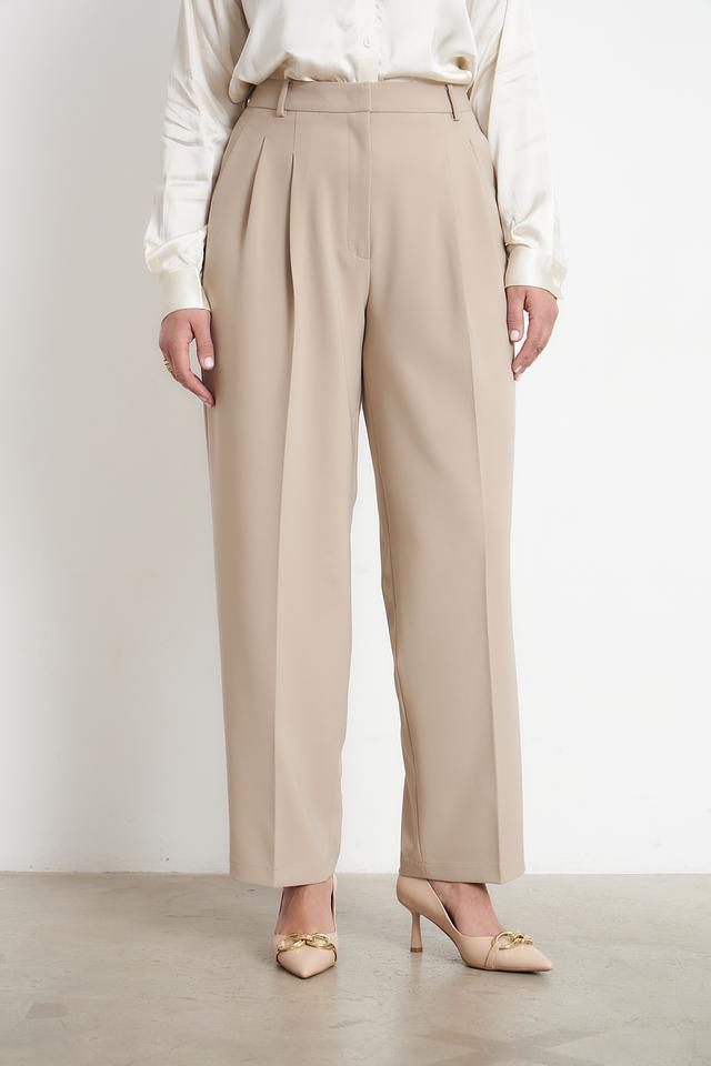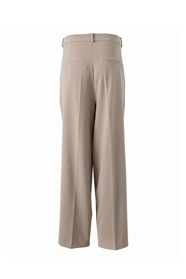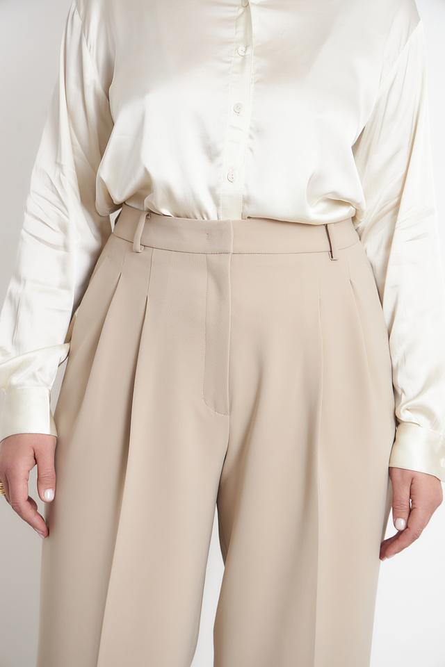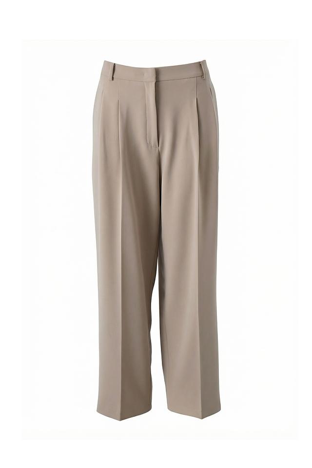 Брюки имеют завышенную талию, которая визуально удлиняет ноги и подчеркивает фигуру. Складки на талии добавляют объема и создают элегантный силуэт. Застежка на молнию и пуговицу обеспечивает надежную фиксацию.