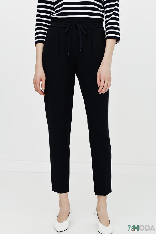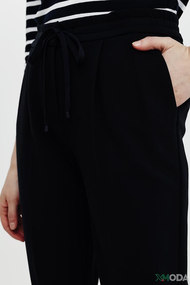 Брюки имеют прямой крой и стандартную посадку по фигуре. Пояс дополнен кулиской с кисточками, что позволяет регулировать облегание и создавать желаемый силуэт. Ткань, состоящая из вискозы, полиамида и эластана, приятна к телу и обеспечивает комфорт в течение всего дня.