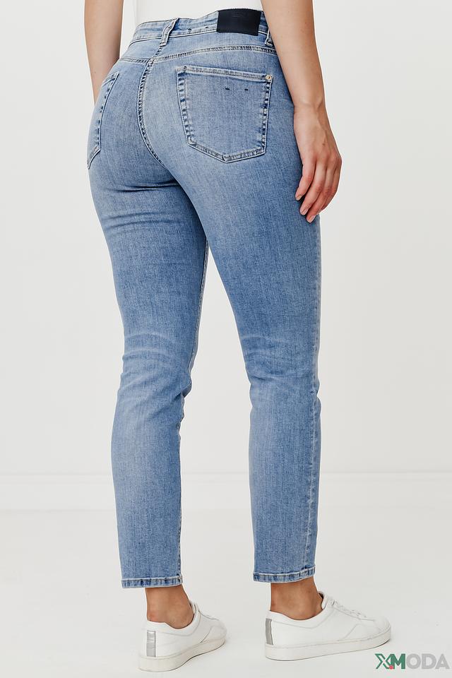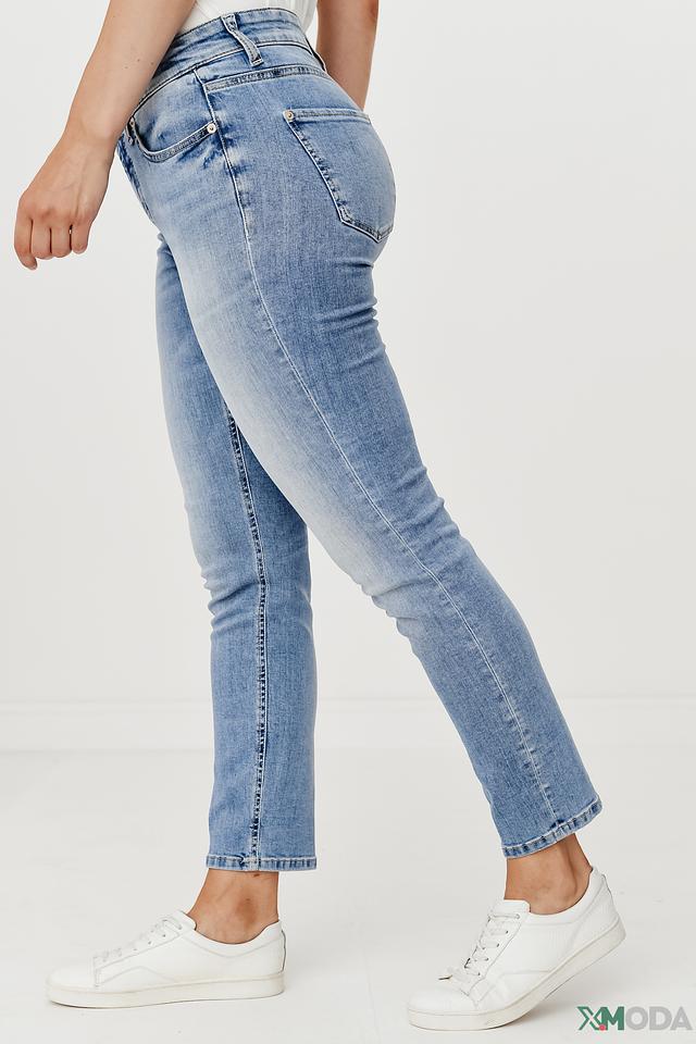 Джинсы имеют классическую посадку на талии и зауженный крой, который визуально стройнит фигуру. Ткань состоит из 92% хлопка, 6% эластомультиэстера и 2% эластана, что обеспечивает мягкость, эластичность и долговечность изделия. Декоративные потертости и легкий эффект вымытости придают джинсам непринужденный и современный вид.