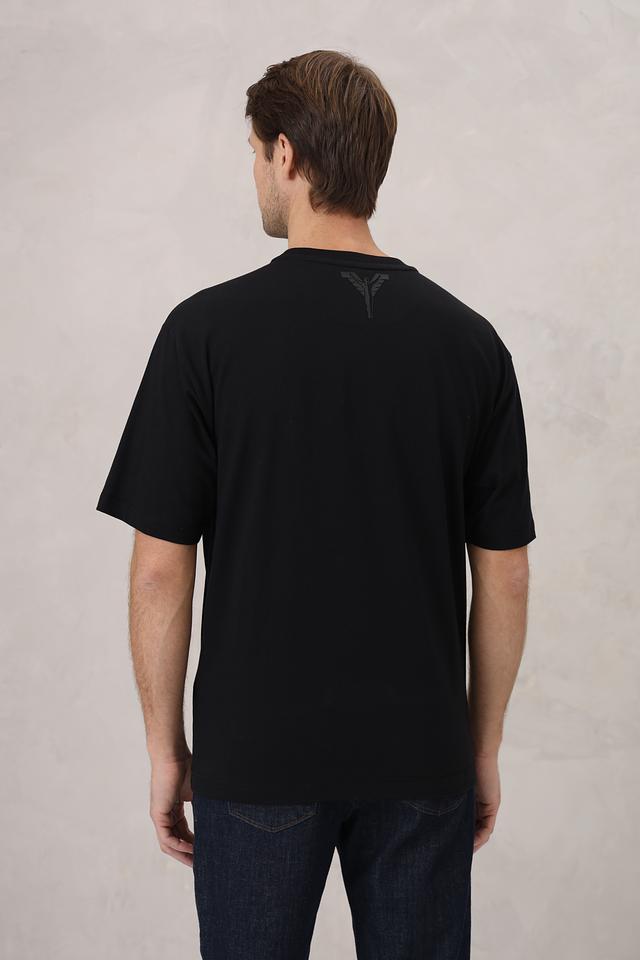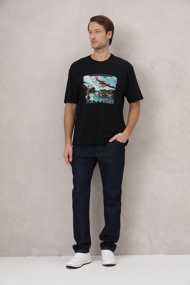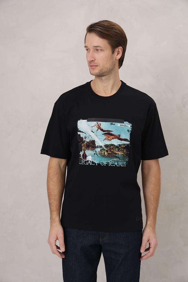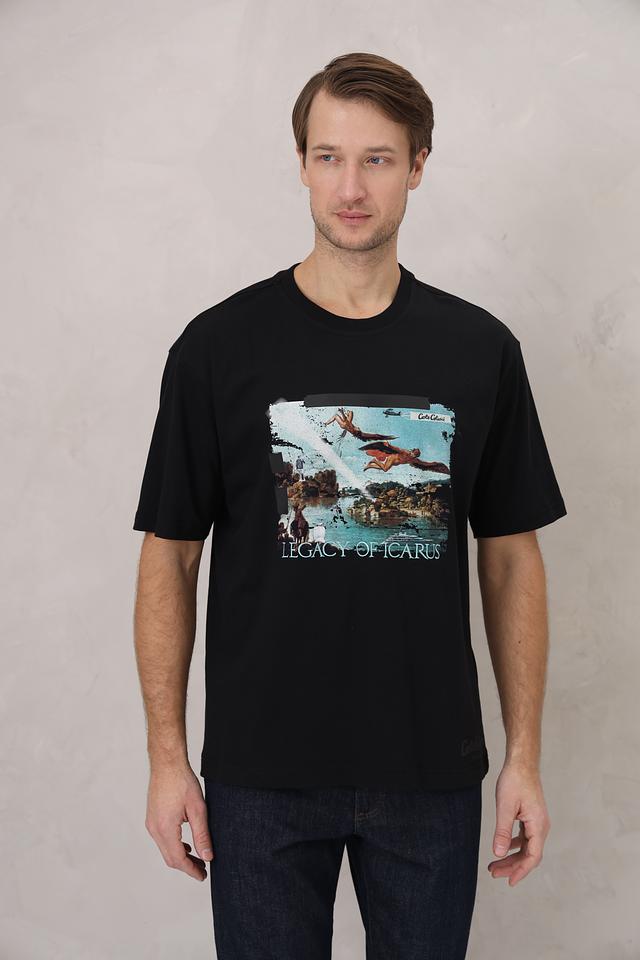 Мужская футболка Carlo Colucci чёрного цвета с ярким принтом "Legacy of Icarus" на груди. Изготовлена из 100% хлопка, обеспечивая комфорт и воздухопроницаемость. Стильный дизайн и свободный крой делают эту футболку отличным выбором для повседневной носки. Состав: хлопок 100%