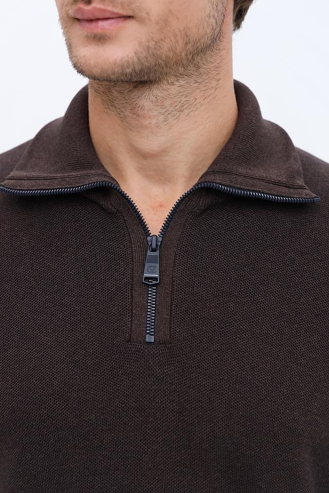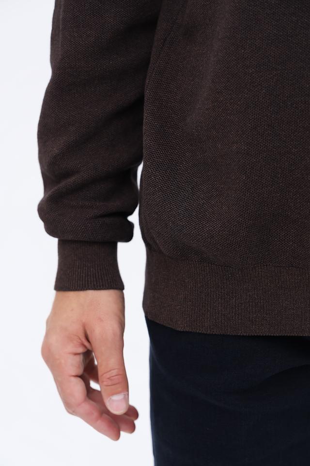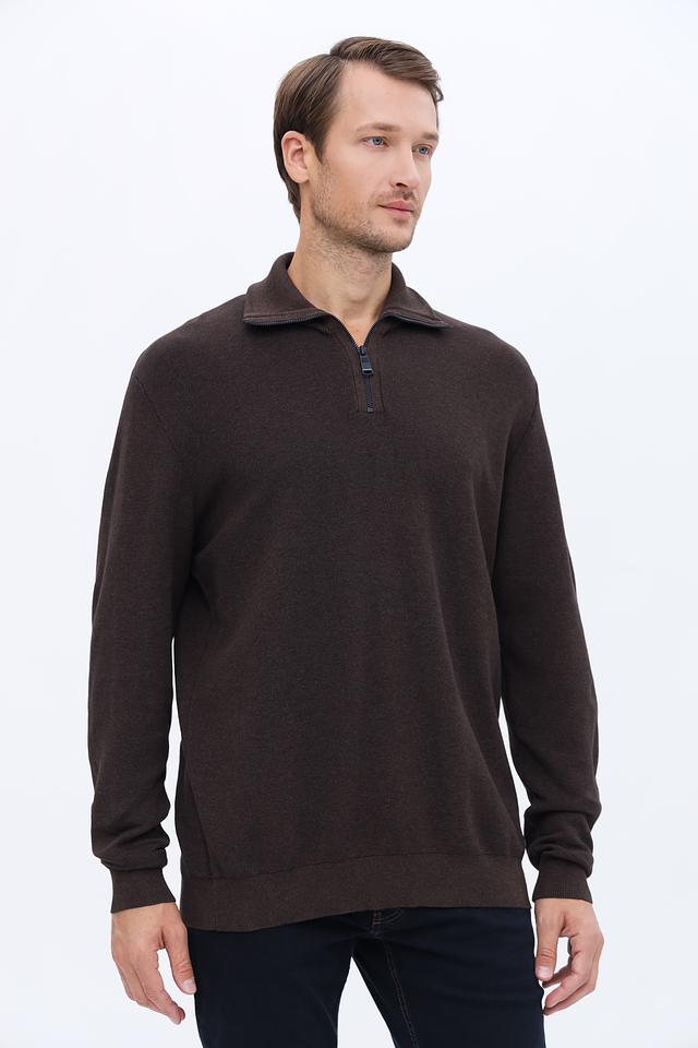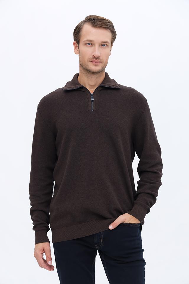 Пуловер имеет классический крой и воротник с короткой молнией, что позволяет регулировать степень защиты от холода. Коричневый цвет делает его универсальным элементом гардероба, который легко сочетается с различными стилями одежды.
