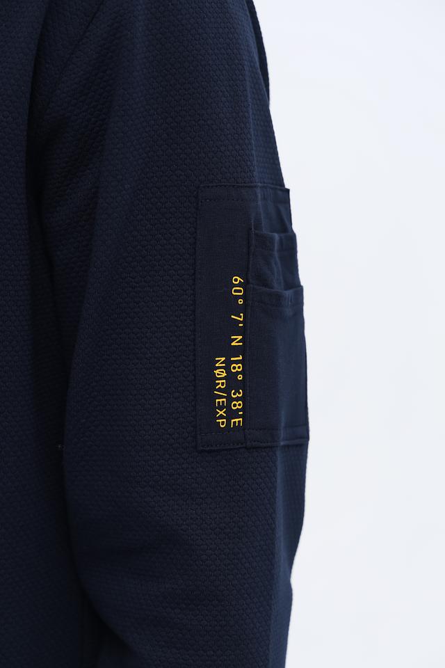 Модель имеет прямой крой, круглый вырез горловины и длинные рукава с манжетами. На левом рукаве расположен накладной карман с декоративной отделкой, добавляющий образу динамичности.