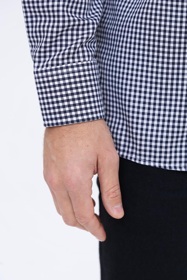 Рубашка имеет классический крой и длинные рукава. Её отличает стильный принт в синюю клетку, который придаёт образу свежесть и динамичность. Воротник рубашки выполнен в классическом стиле, что позволяет сочетать её с различными галстуками и другими аксессуарами.