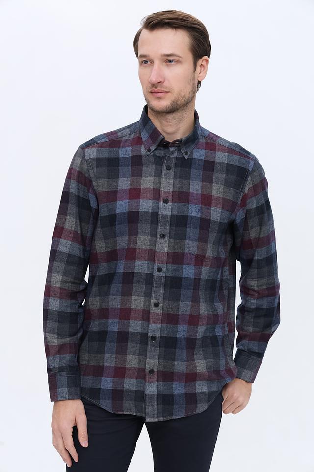 Дизайн рубашки представлен классической клеткой, сочетающей в себе оттенки бордового, синего и серого. Такая расцветка делает рубашку универсальной и легко сочетаемой с различными элементами гардероба.