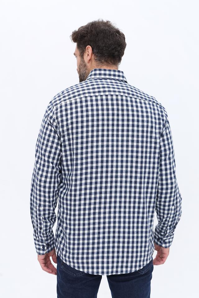 Рубашка имеет классический крой и оформлена в синюю клетку, что делает ее универсальной и подходящей для различных стилей. Длинные рукава и воротник придают ей элегантный вид.