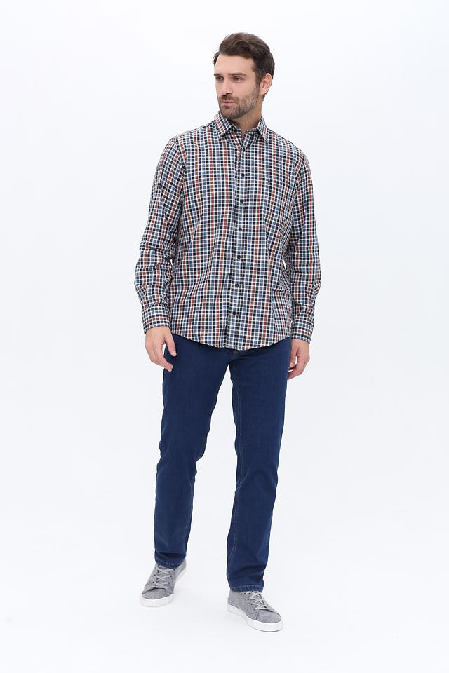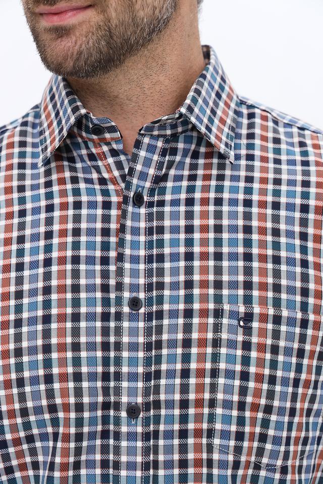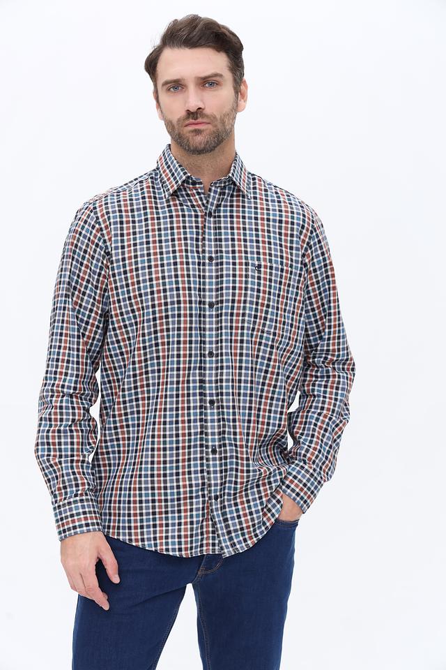 Рубашка имеет классический крой и длинные рукава. Её отличает яркий клетчатый рисунок, сочетающий в себе оттенки синего, коричневого и оранжевого. Воротник рубашки выполнен в классическом стиле, что позволяет носить её как с галстуком, так и без.