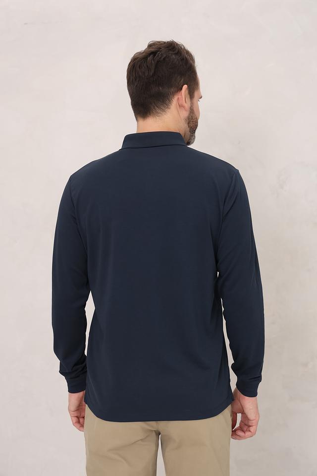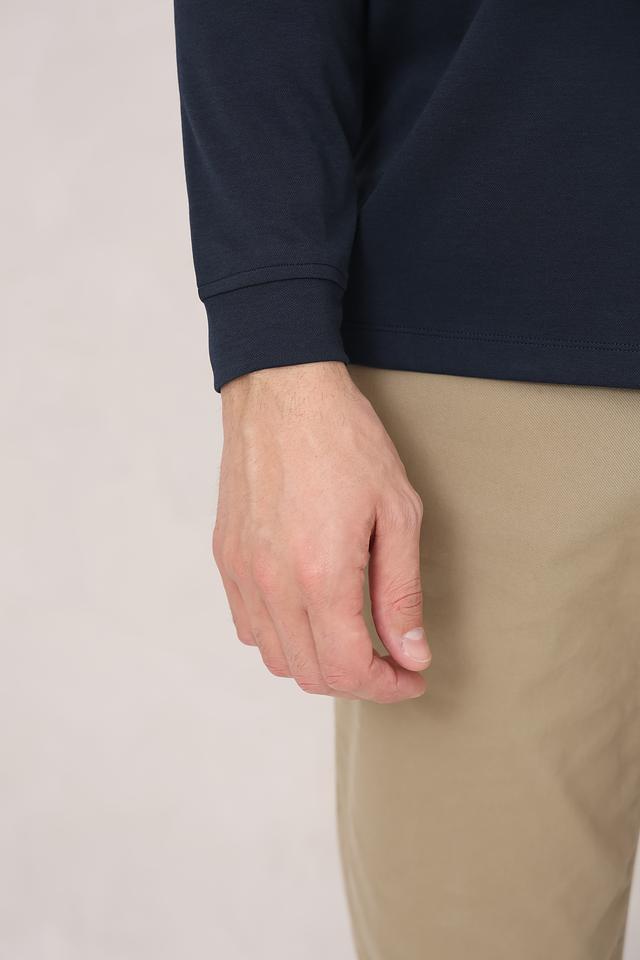 Воротник поло выполнен из эластичного материала, что обеспечивает плотное прилегание к шее. Длинные рукавы делают эту модель подходящей для прохладной погоды.