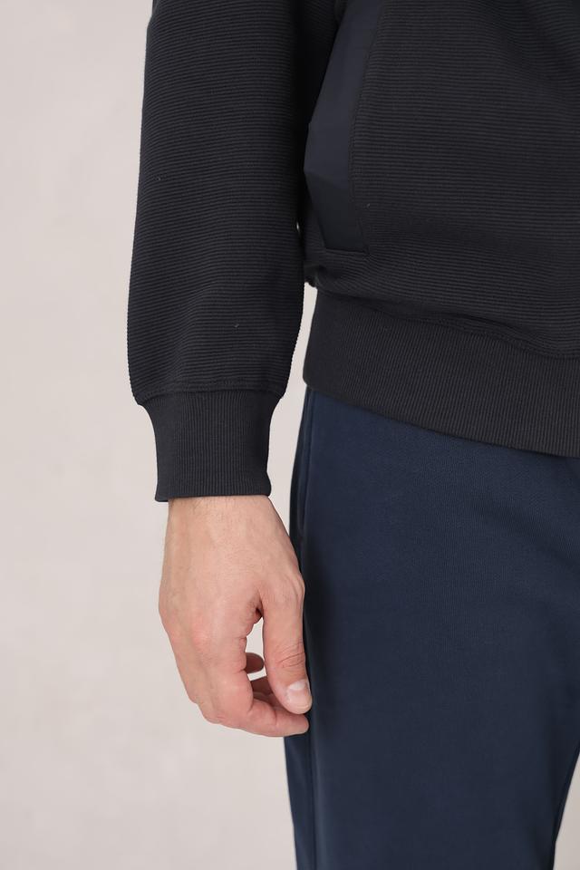 Кардиган имеет удобную застежку-молнию, боковые карманы и эластичные манжеты. Текстурированная поверхность ткани добавляет визуальный интерес. Состав ткани – 95% хлопок и 5% эластан, обеспечивающий мягкость, воздухопроницаемость и небольшую эластичность.