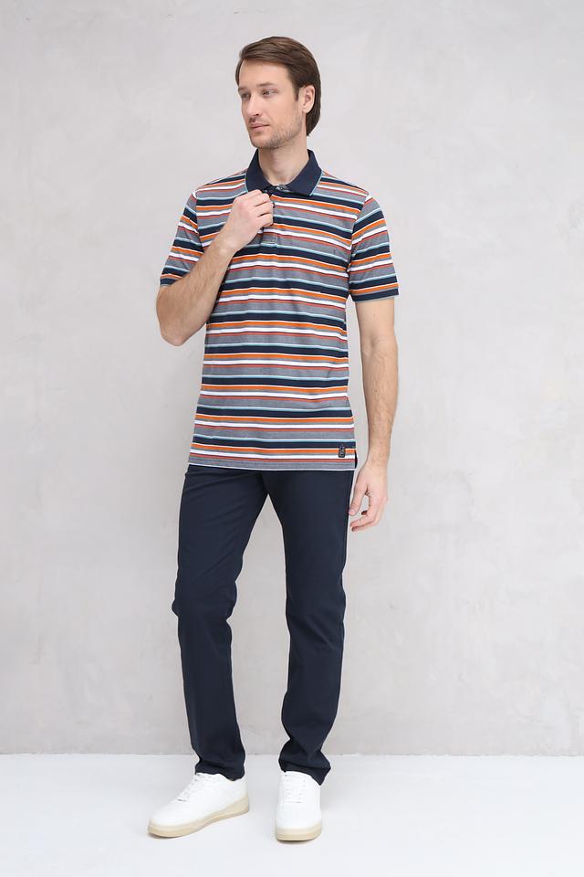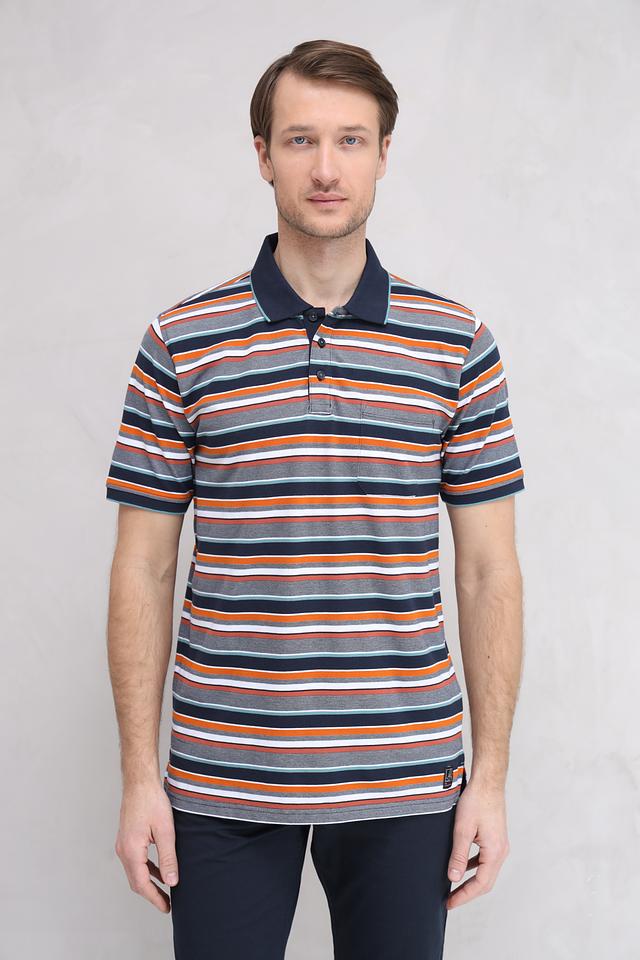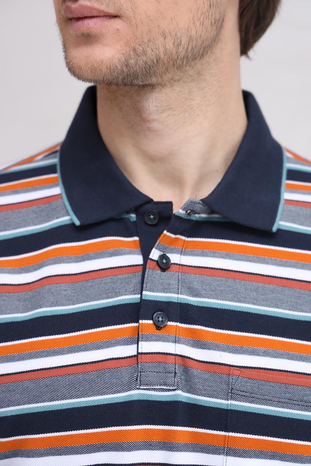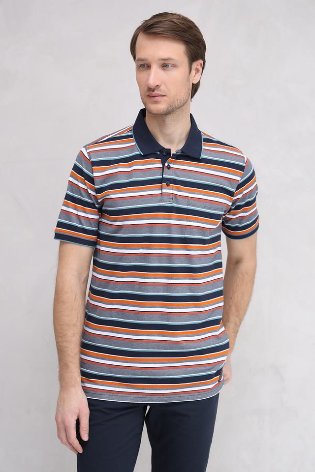 Модель выполнена в яркой полосатой расцветке, сочетающей в себе оттенки синего, оранжевого, серого и белого. Классический крой с коротким рукавом и воротником-поло делает эту рубашку универсальной для различных ситуаций. Наличие нагрудного кармана добавляет функциональности и акцентирует внимание на деталях.