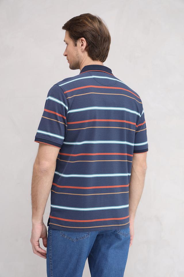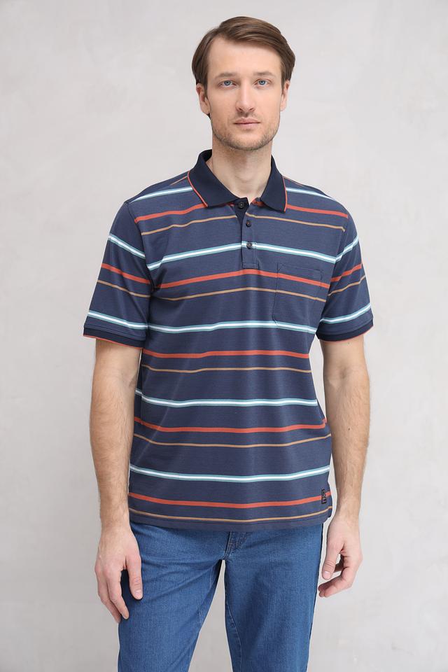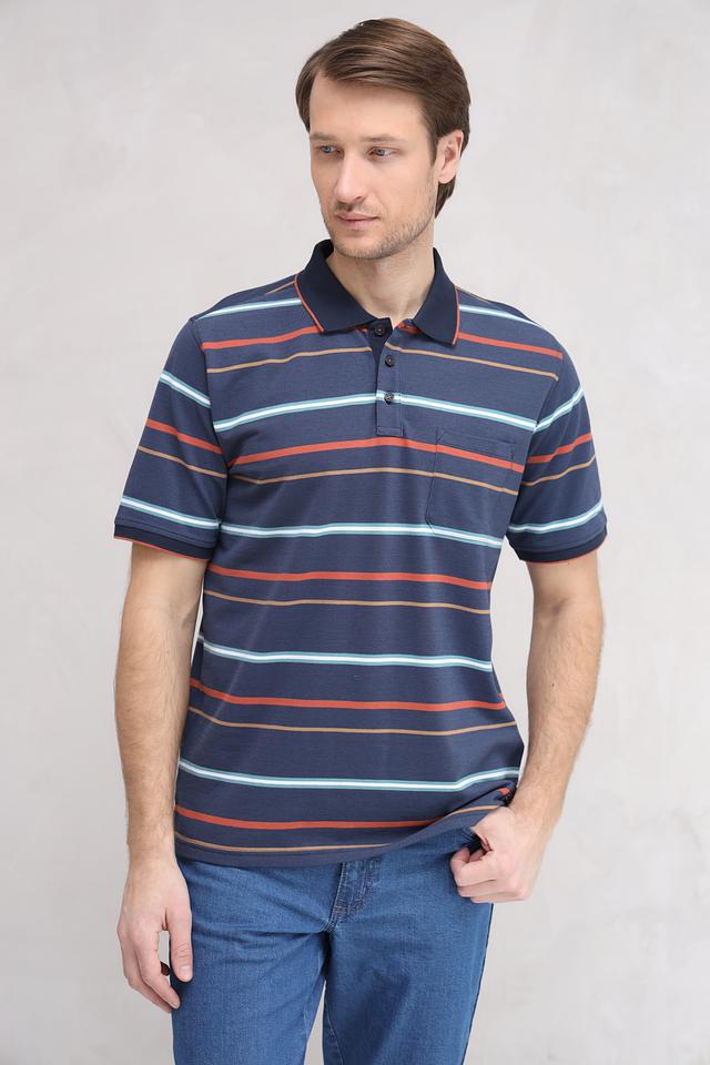 Мужское поло Casa Moda синего цвета с ярким полосатым принтом. Изготовлено из сочетания хлопка и полиэстера, обеспечивающего комфорт и практичность. Классический крой и короткий рукав делают эту модель универсальной для повседневной носки. Состав: полиэстер 50%, хлопок 50%