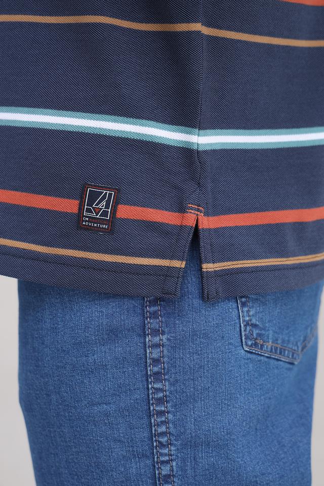 Это мужское поло от бренда Casa Moda выполнено в классическом стиле с ярким полосатым рисунком. Основной цвет – тёмно-синий, дополненный полосами красного, белого, горчичного и бирюзового оттенков.