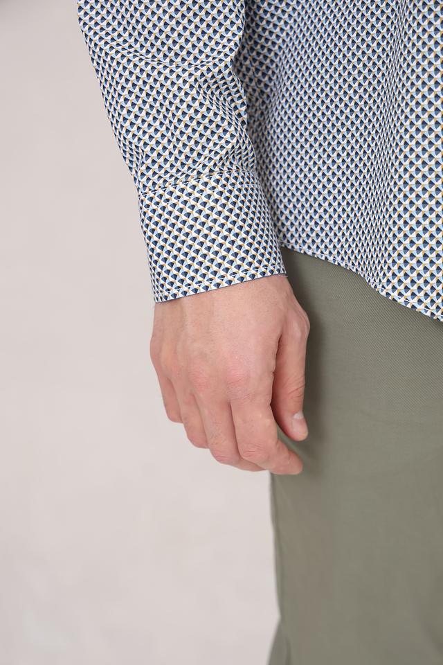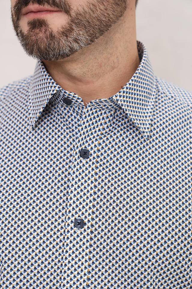 Рубашка имеет классический крой с длинными рукавами и стандартным воротником. Её отличает оригинальный синий цвет и мелкий геометрический принт, который придаёт образу изысканность и индивидуальность.