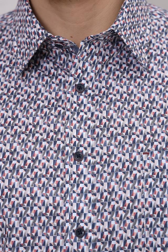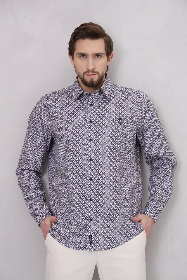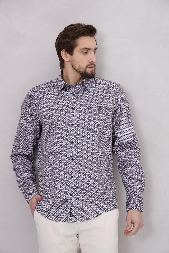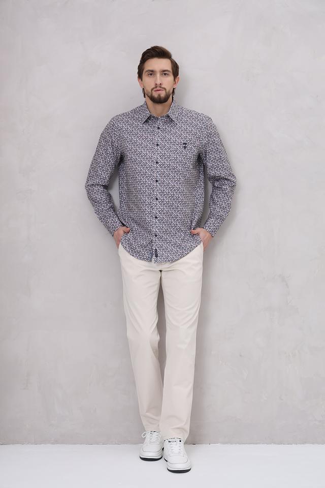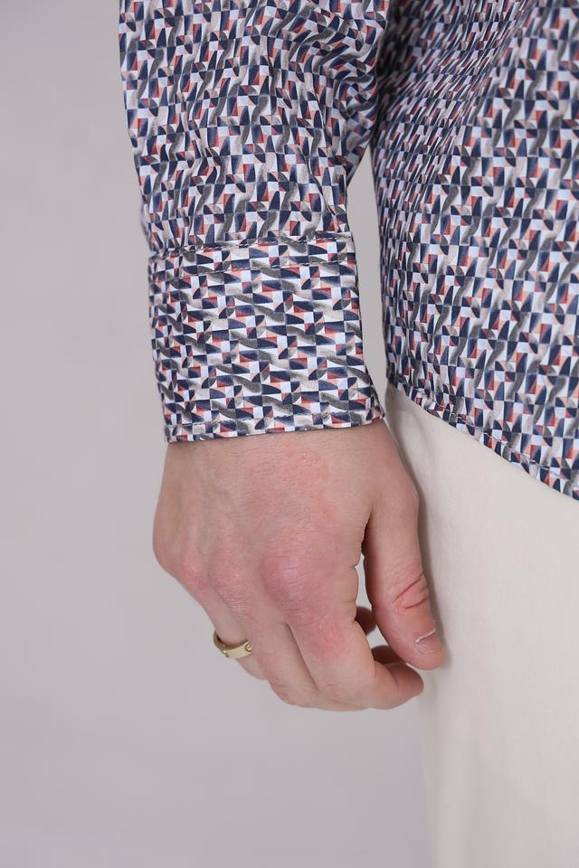 Особенностью данной модели является яркий геометрический принт, выполненный в синих, белых и серых тонах. Такой рисунок добавит вашему образу оригинальности и индивидуальности. Рубашка идеально подойдет для создания как повседневных, так и более формальных образов.