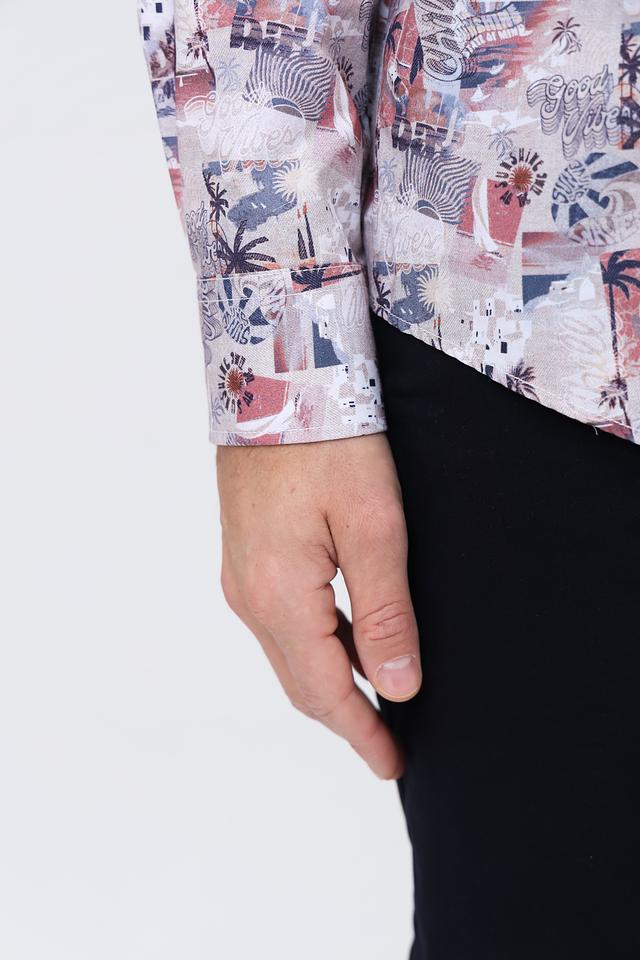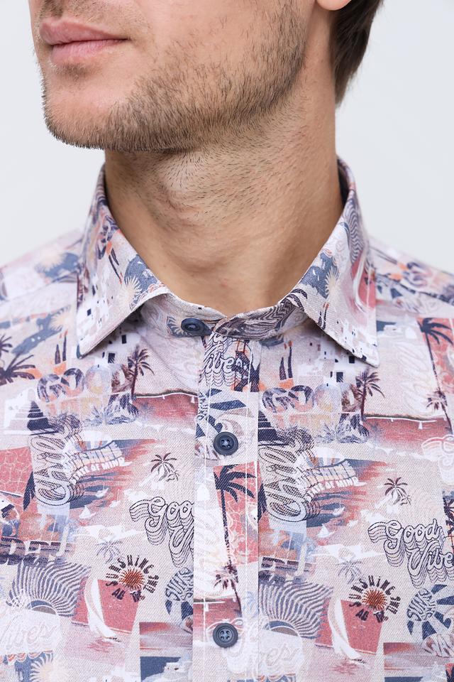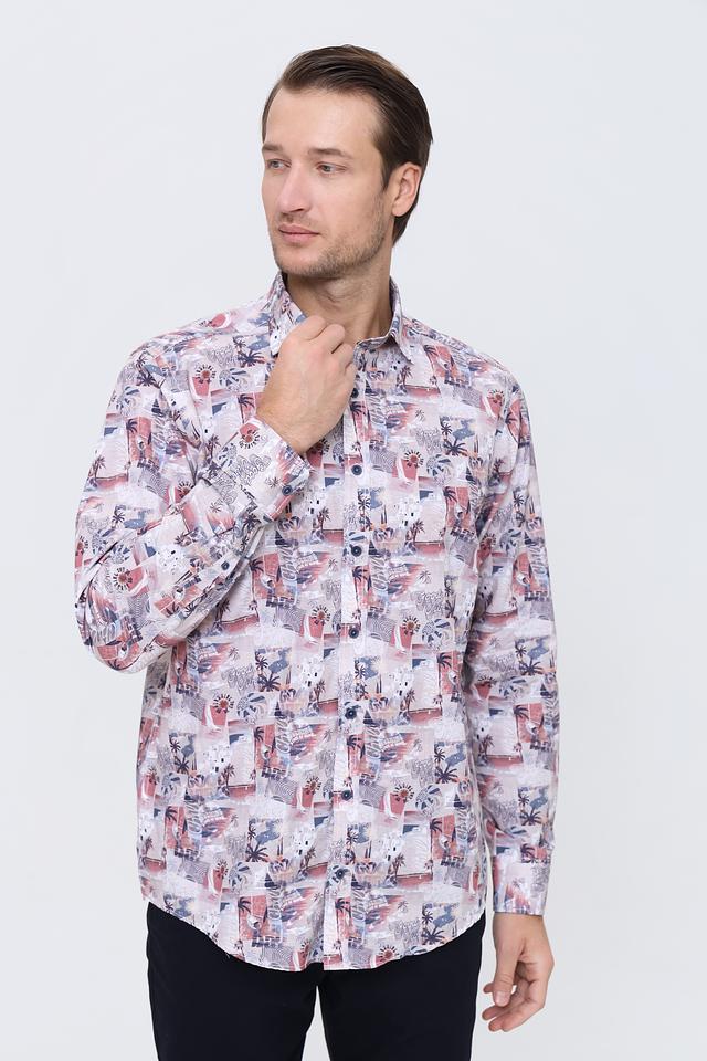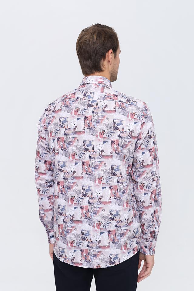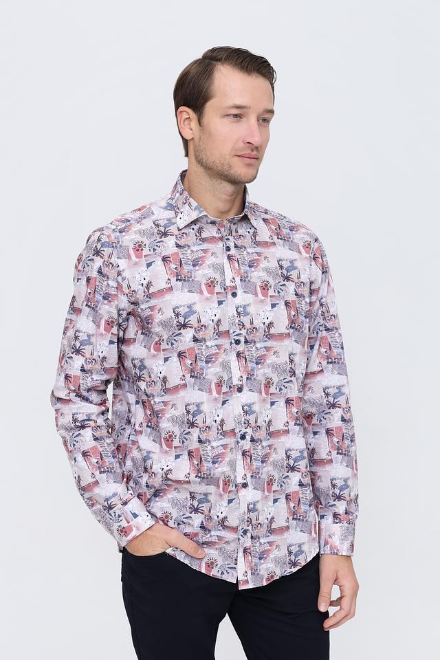 Рубашка имеет классический крой с длинными рукавами и стандартной посадкой. Её отличает оригинальный принт с изображением тропических растений и пейзажей, выполненный в ярких и насыщенных цветах.