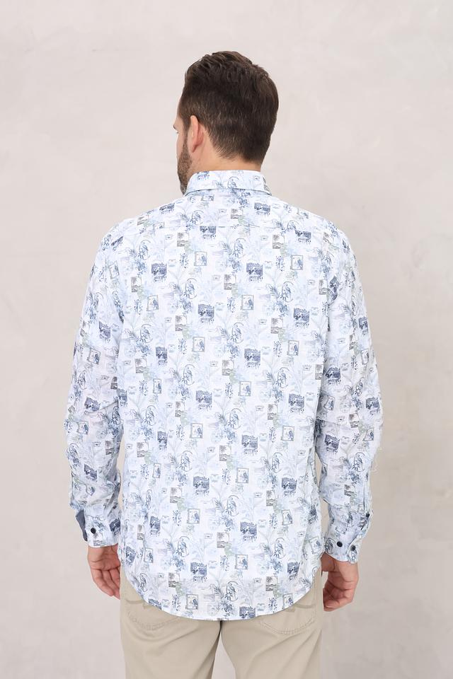 Рубашка имеет классический крой с длинными рукавами и стандартной посадкой. Её отличает яркий и запоминающийся принт, выполненный в голубой цветовой гамме с добавлением различных рисунков и узоров.