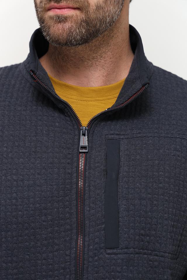 Мужской кардиган Casa Moda темно-синего цвета с фактурной стеганой поверхностью. Изготовлен из сочетания полиэстера, хлопка и эластана, обеспечивающего комфорт и удобство в носке. Состав: полиэстер 57%, хлопок 40%, эластан 3%