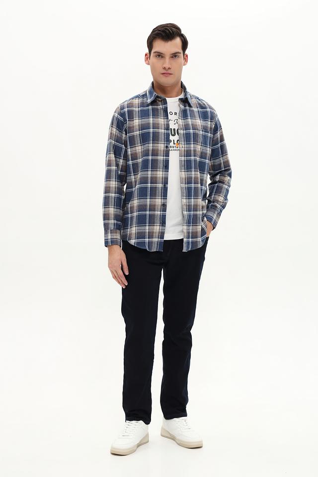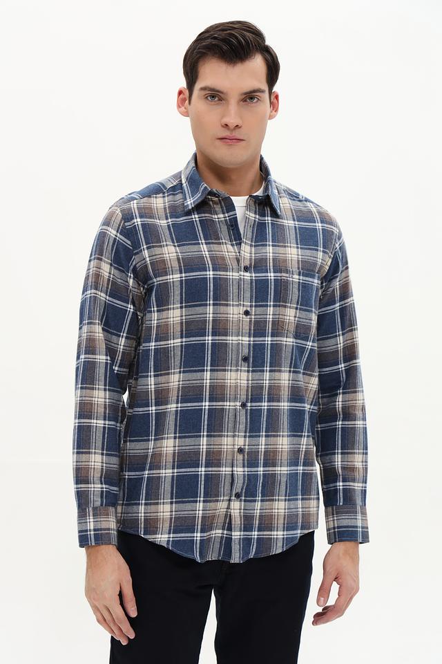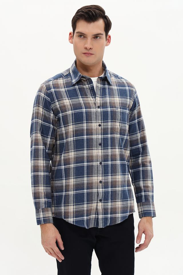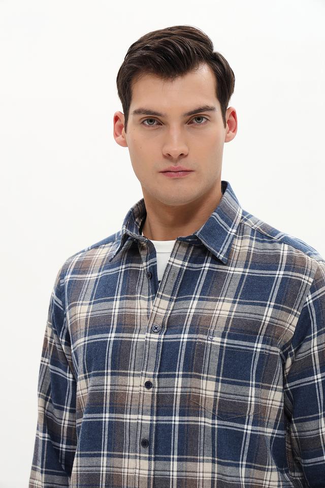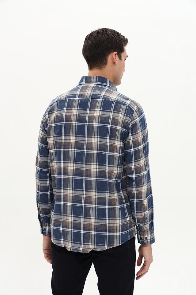 Рубашка выполнена в классическом крое с длинными рукавами и традиционным воротником. Особенностью модели является клетчатый рисунок в синих, белых и бежевых тонах, который придает ей универсальность и позволяет легко сочетать с различными элементами гардероба.