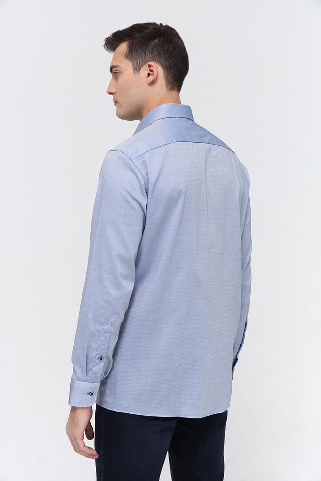 Рубашка имеет классический крой с длинными рукавами и воротником. На груди расположен накладной карман. Застежка на пуговицах по всей длине. Изготовлена из высококачественного хлопка с добавлением эластана, что обеспечивает комфорт и удобство в носке.
