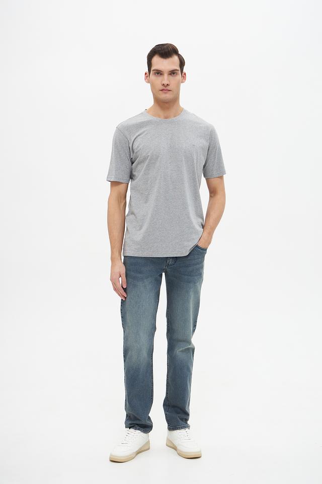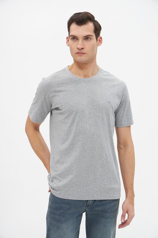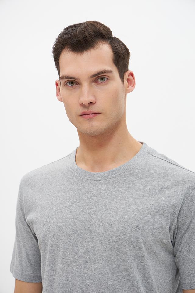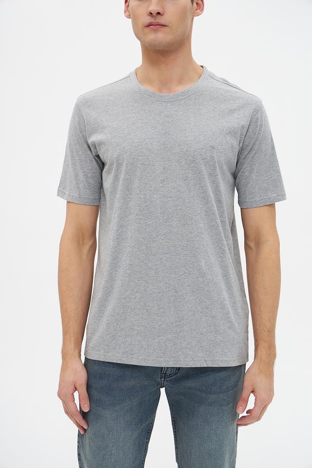 Цвет футболки – серый меланж, что делает ее универсальной и легко сочетаемой с различными элементами гардероба. Округлый вырез горловины и короткие рукава обеспечивают удобство и свободу движений.