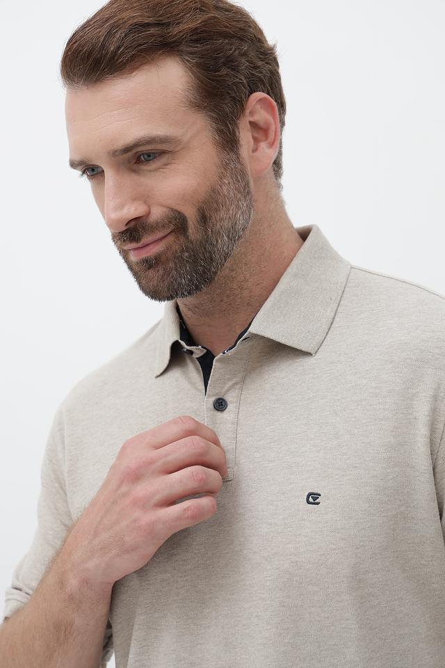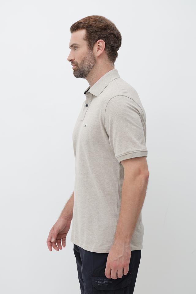 Поло имеет классический крой, короткие рукава и воротник-поло с небольшой планкой, застегивающейся на пуговицы. На груди расположена небольшая вышивка с логотипом бренда. Бежевый цвет поло делает его универсальным и легко сочетаемым с различными элементами гардероба.