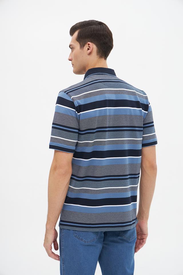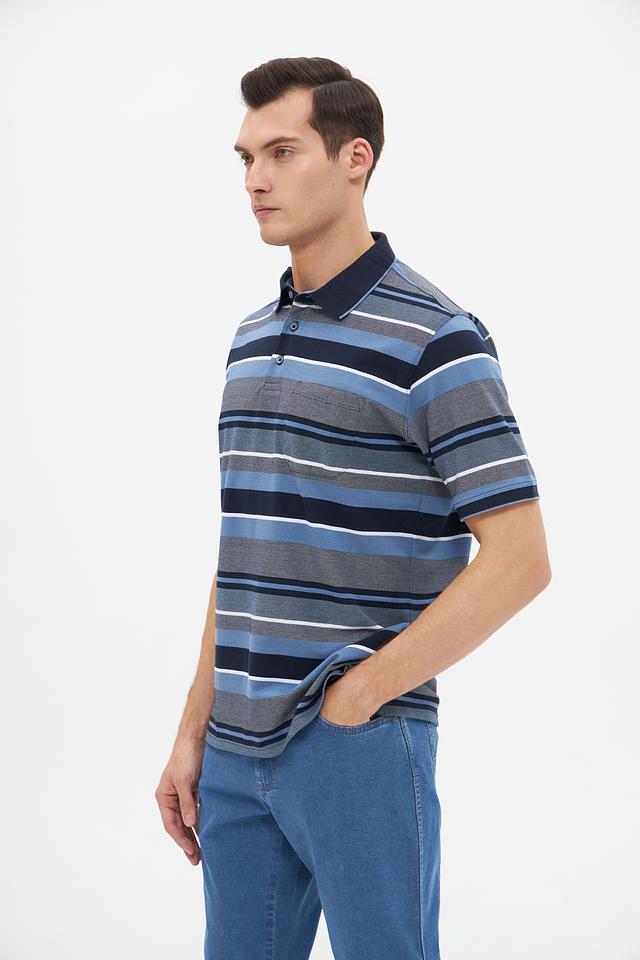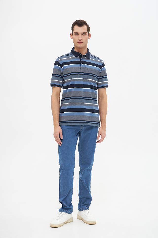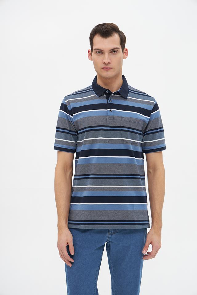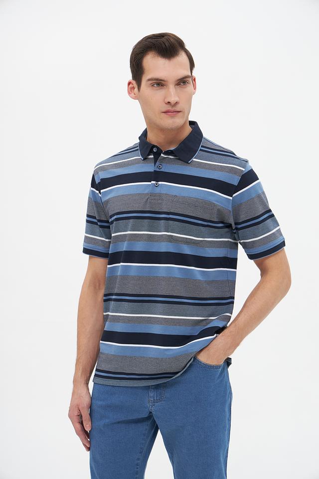 Мужское поло Casa Moda синего цвета с классическим дизайном в полоску. Изготовлено из сочетания хлопка и полиэстера, обеспечивающего комфорт и практичность. Состав: полиэстер 50%, хлопок 50%