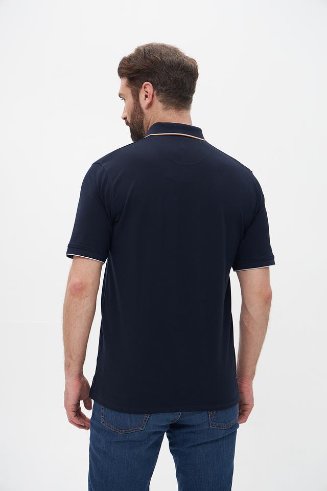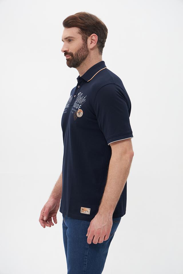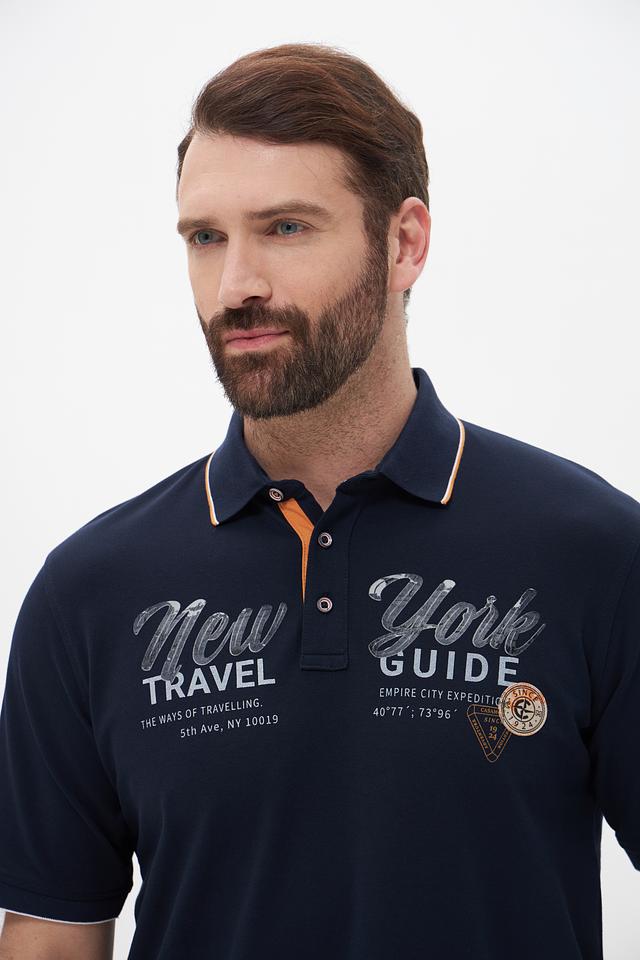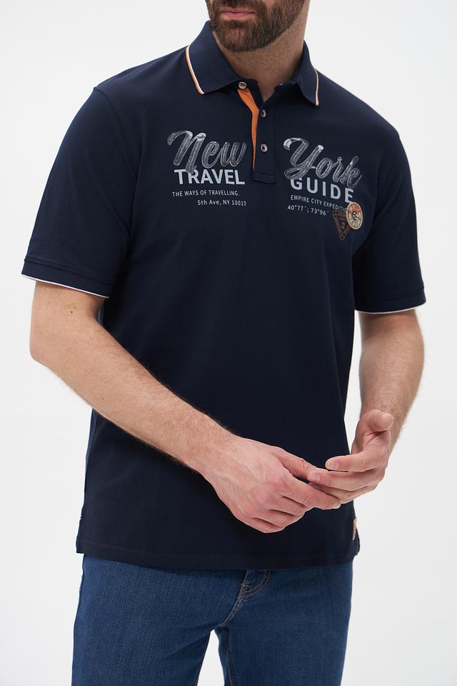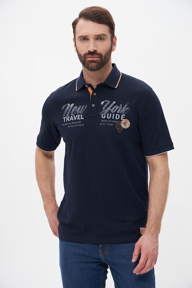 Мужское поло Casa Moda темно-синего цвета с ярким принтом "New York Travel". Изготовлено из мягкого хлопка с добавлением эластана для комфорта и сохранения формы. Стильный и удобный выбор для повседневной носки. Состав: хлопок 95%, эластан 5%