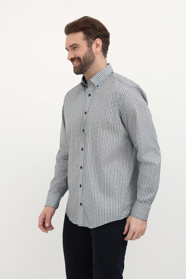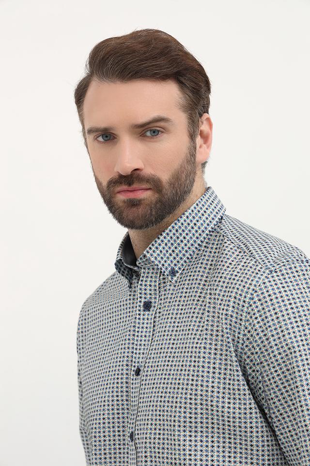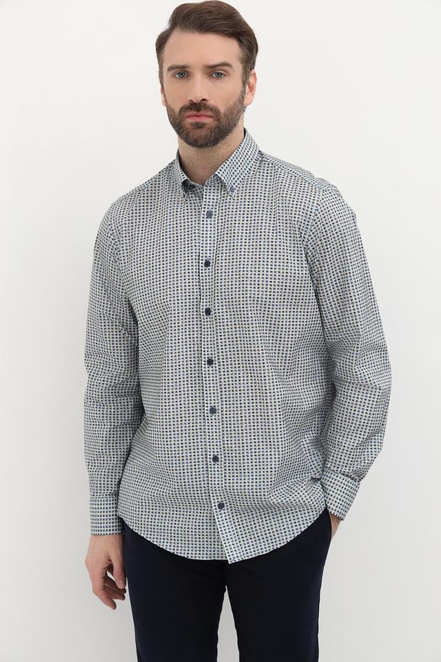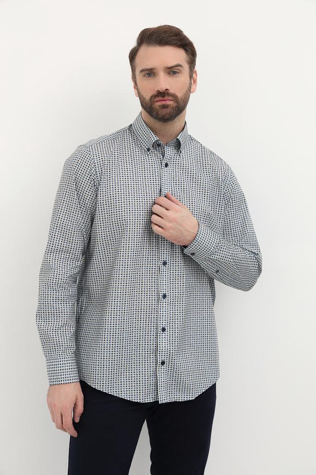 Мужская рубашка Casa Moda светло-серого цвета с мелким синим рисунком в клетку. Изготовлена из 100% хлопка, обеспечивающего комфорт и воздухопроницаемость. Состав: хлопок 100%