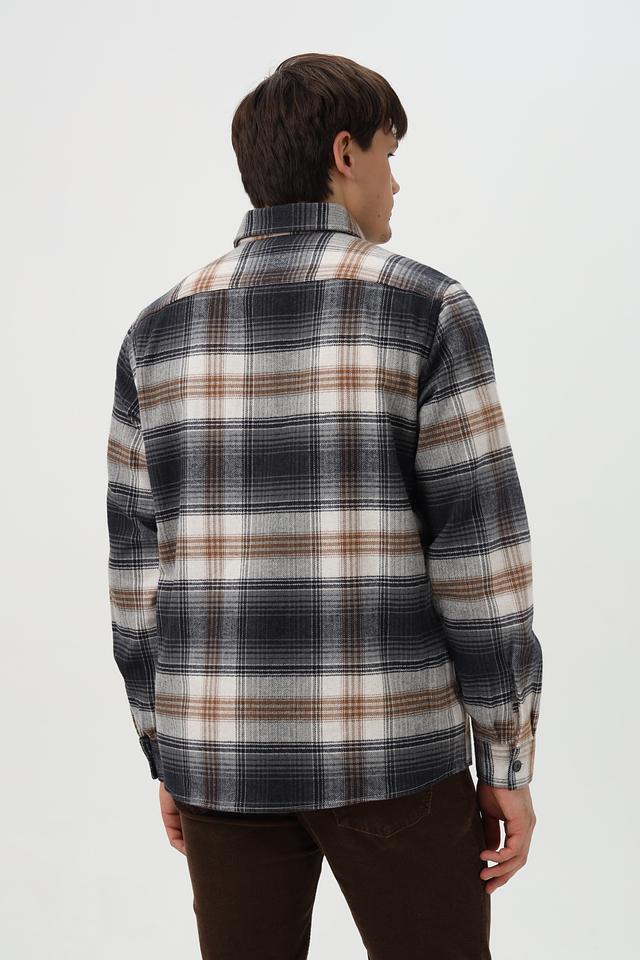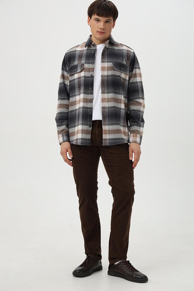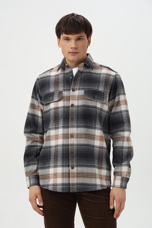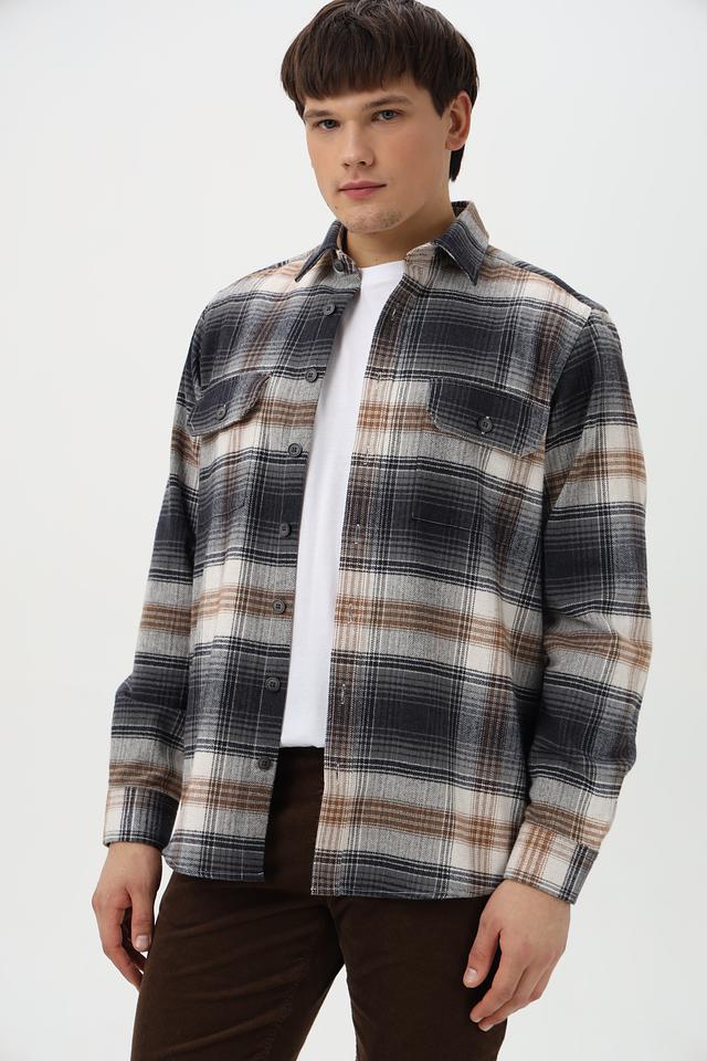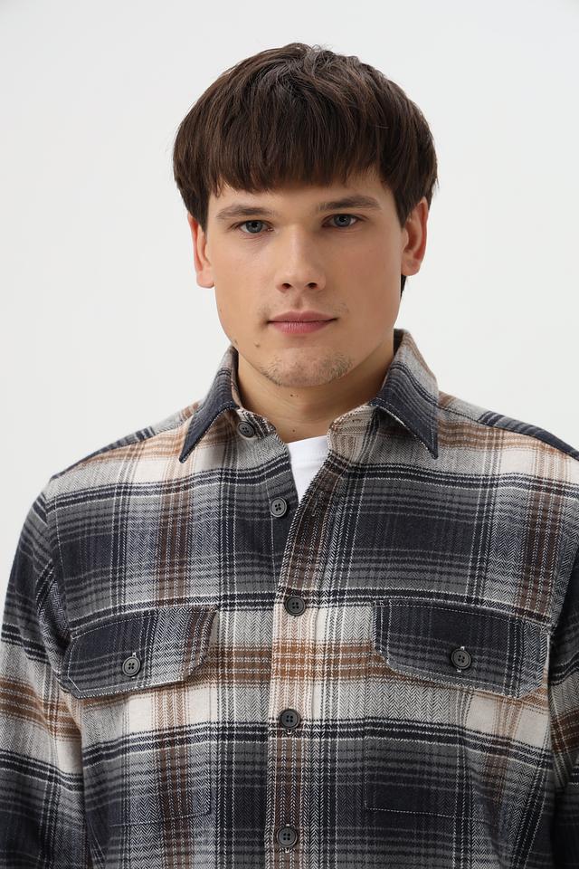 Основной цвет рубашки – сочетание синего, серого и бежевого, оформленное в клетчатый узор. Такой принт добавляет образу динамичности и универсальности. Рубашка имеет нагрудный карман с клапаном, что придает ей более расслабленный вид.