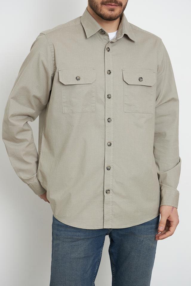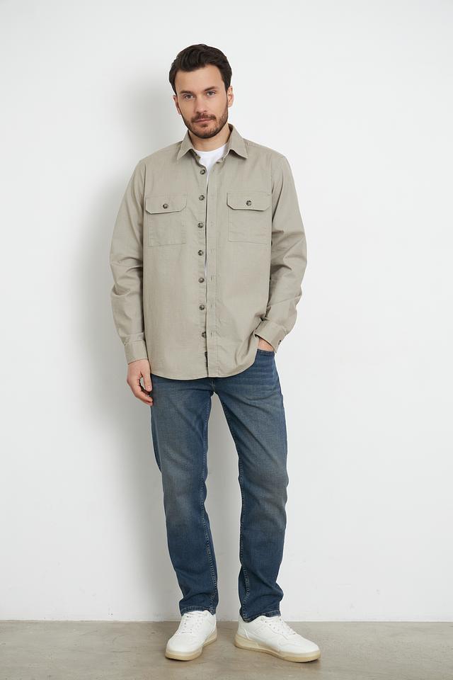 Рубашка имеет две нагрудные карманы с клапанами, которые добавляют функциональности и стиля. Застежка на пуговицы по всей длине обеспечивает удобство надевания и снятия. Состав ткани включает 83% хлопок, 13% полиэстер и 4% эластан, что обеспечивает приятные тактильные ощущения, хорошую износостойкость и небольшую эластичность.