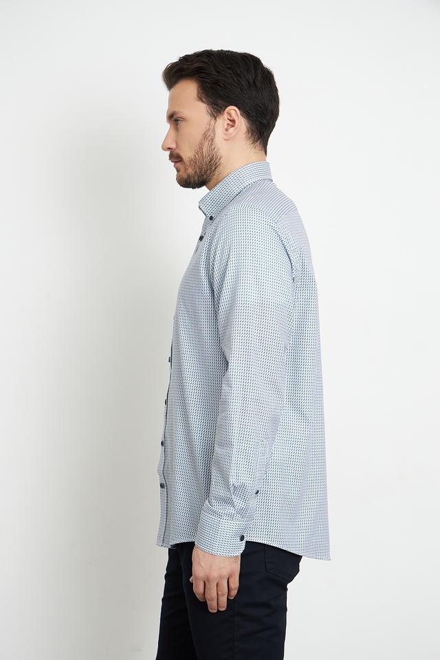 Особенностью данной модели является мелкий геометрический рисунок в голубых и белых тонах, который придает ей стильный и современный вид. Рубашка застегивается на пуговицы, которые гармонично сочетаются с общим дизайном. Рукава рубашки имеют манжеты на пуговицах, что позволяет регулировать их длину и посадку.