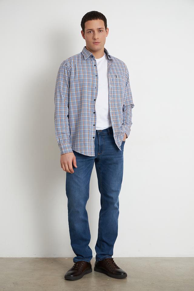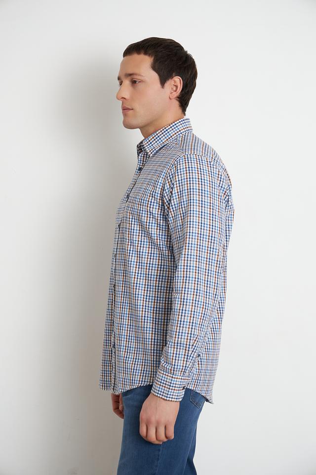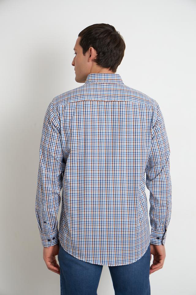 Основной цвет рубашки – синий, дополненный коричневым и голубым клетчатым узором. Это сочетание делает рубашку универсальной и легко сочетаемой с различными элементами гардероба.