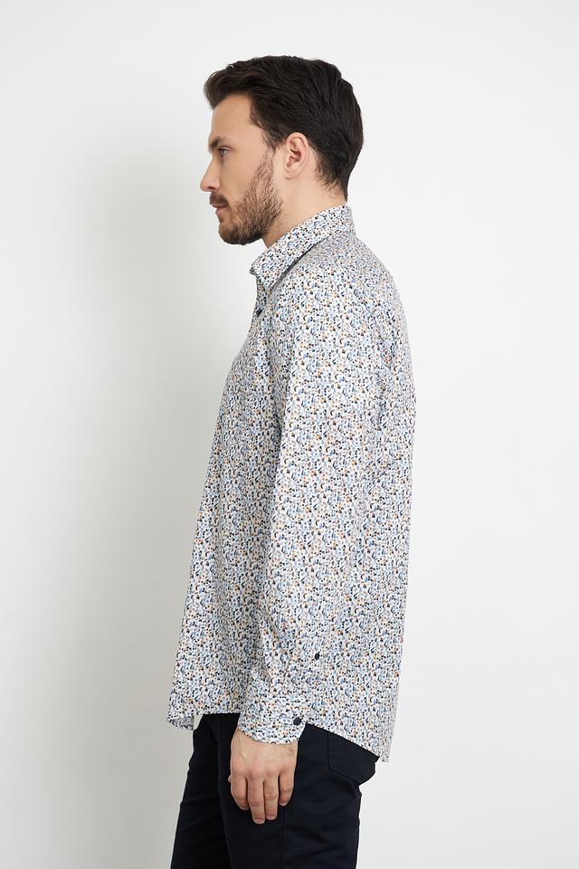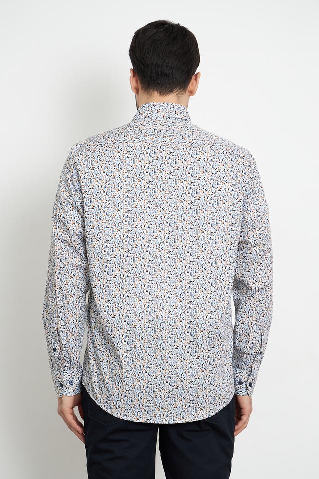 Рубашка имеет классический крой с длинными рукавами и стандартным воротником. Её отличает яркий и оригинальный цветочный принт, выполненный в сочетании голубых, жёлтых и оранжевых оттенков на светло-голубом фоне. Эта рубашка идеально подходит для создания непринужденного, но стильного образа.