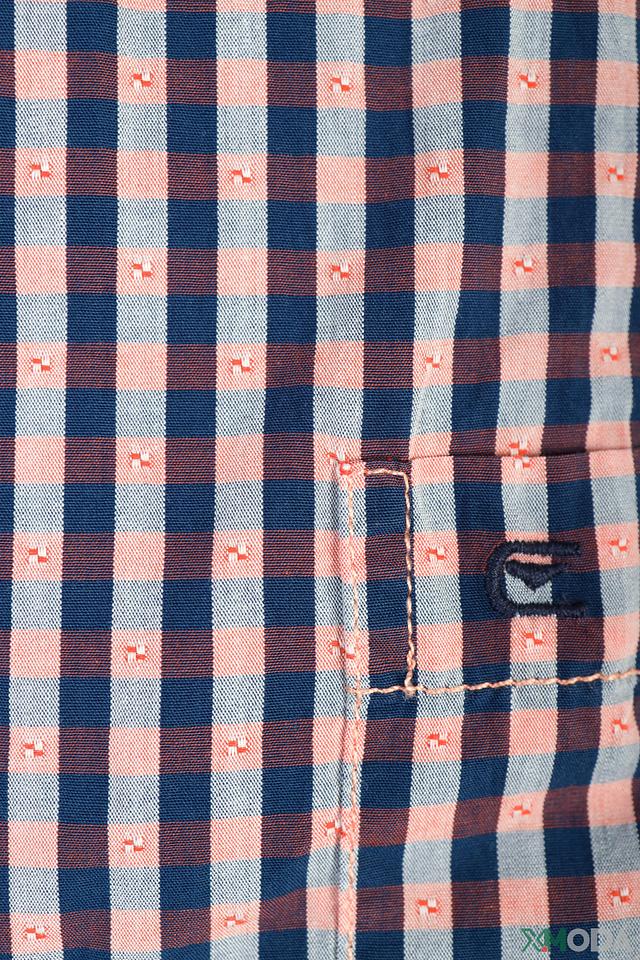 Рубашка имеет классический крой, короткие рукава и воротник на пуговицах. Особенностью модели является стильный клетчатый принт в сине-красной гамме, который придаёт ей современный и привлекательный вид.