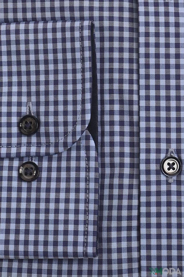 Рубашка имеет классический крой и оформлена в синюю клетку, что придает ей универсальность и позволяет сочетать с различными элементами гардероба. Воротник рубашки выполнен в классическом стиле, а манжеты на пуговицах добавляют ей элегантности.