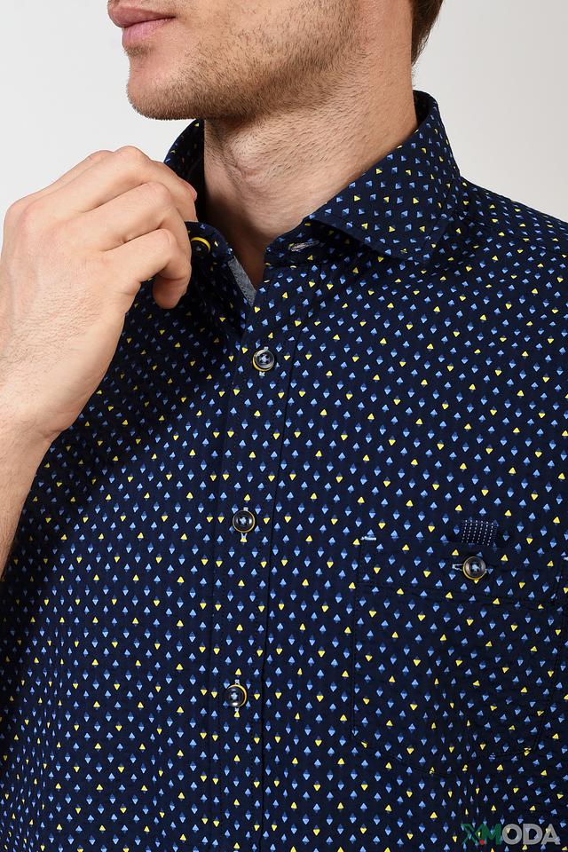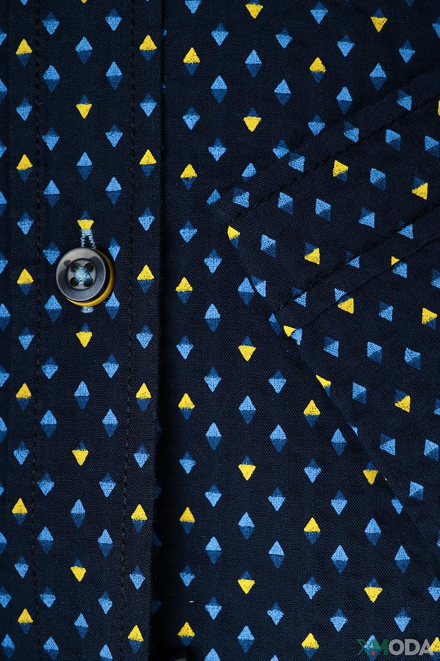 Эта стильная рубашка от Casa Moda станет отличным дополнением к вашему летнему гардеробу. Выполнена в темно-синем цвете и украшена мелким рисунком в виде горошка желтого и белого цветов, что придает ей оригинальность и свежий вид.