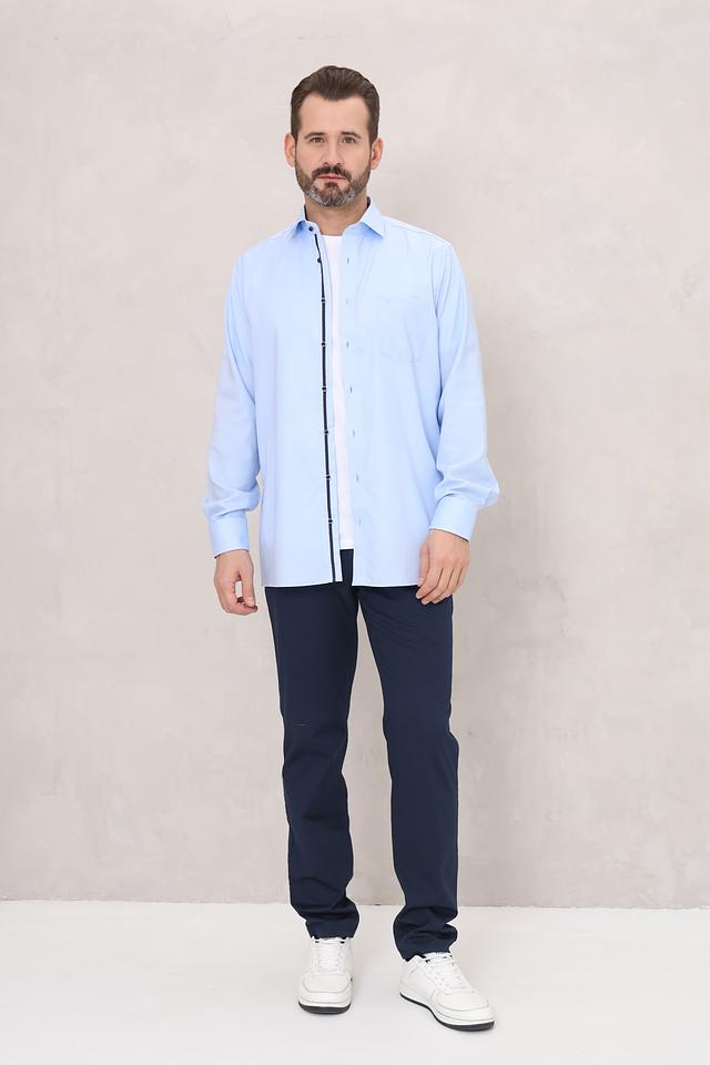 Рубашка имеет классический крой с длинными рукавами и стандартной посадкой. Отличительной особенностью является контрастная отделка по планке пуговиц и на манжетах, выполненная в тёмно-синем цвете, что добавляет рубашке изысканности.