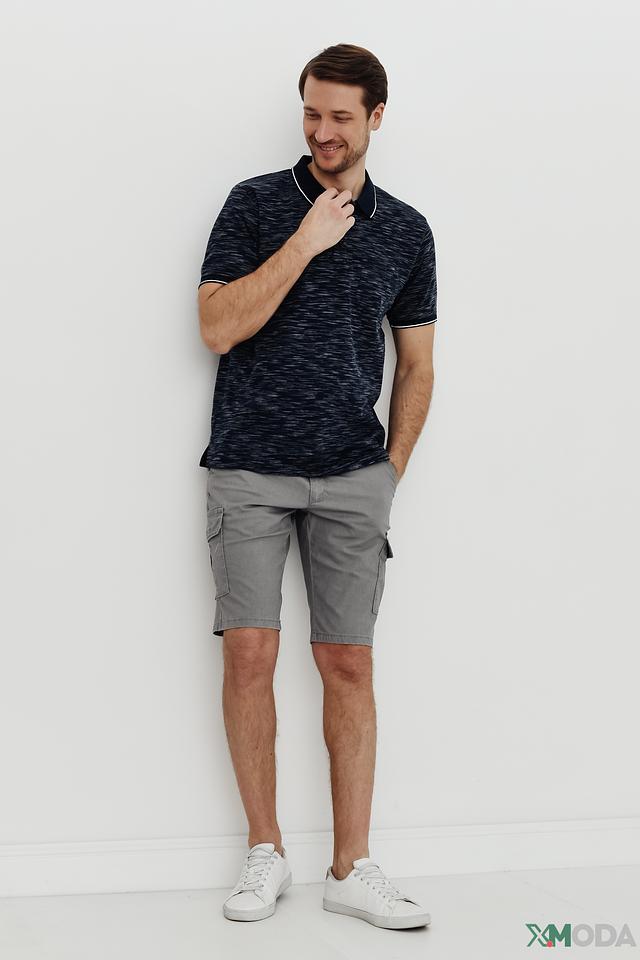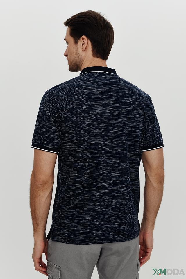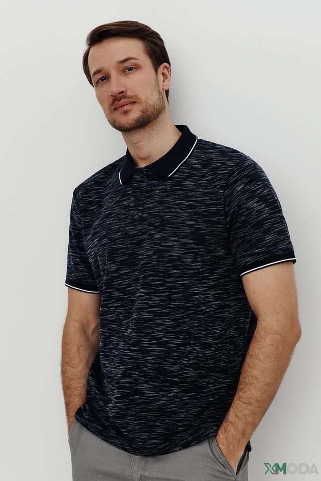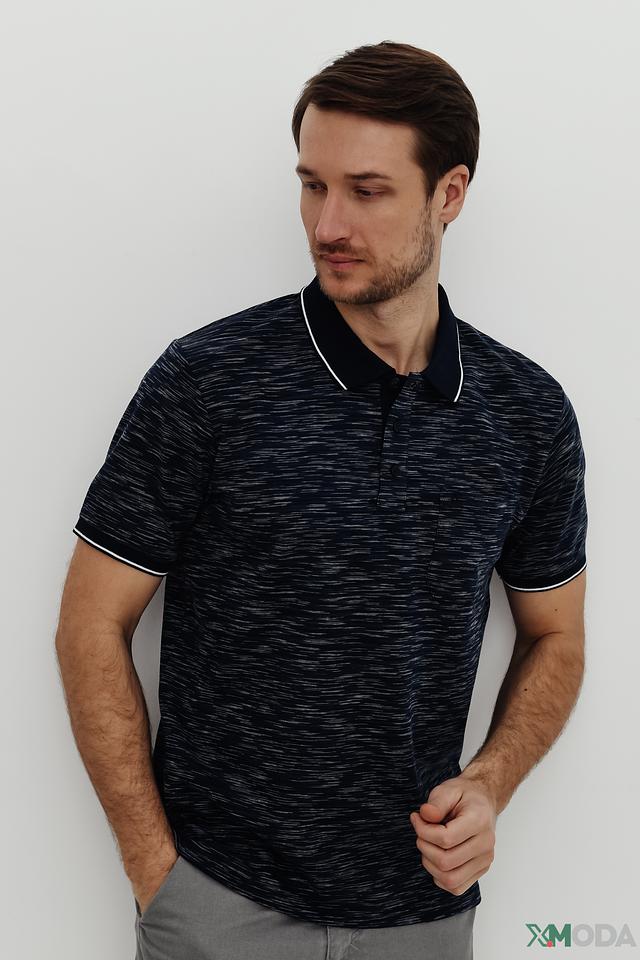 Мужское поло Casa Moda тёмно-синего цвета с оригинальным меланжевым узором и белой отделкой. Изготовлено из сочетания хлопка и полиэстера, обеспечивающего комфорт и практичность. Состав: полиэстер 52%, хлопок 48%
