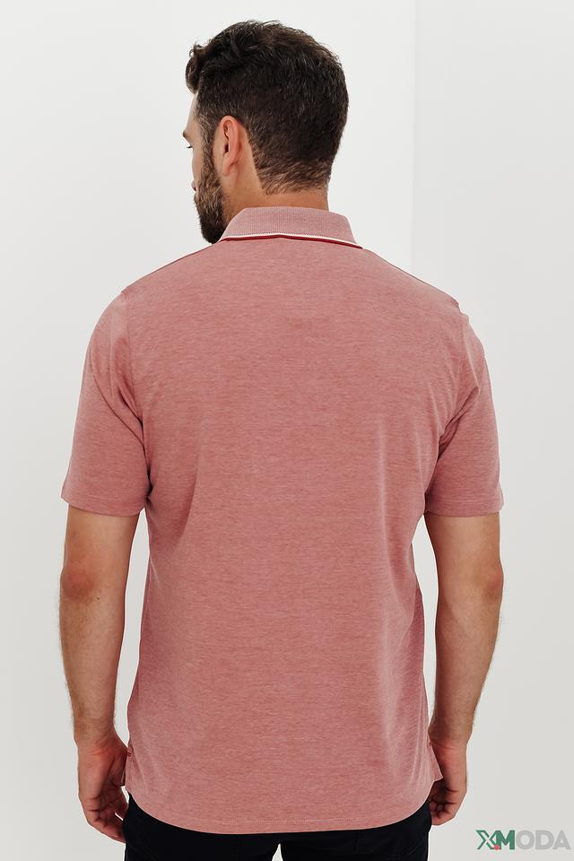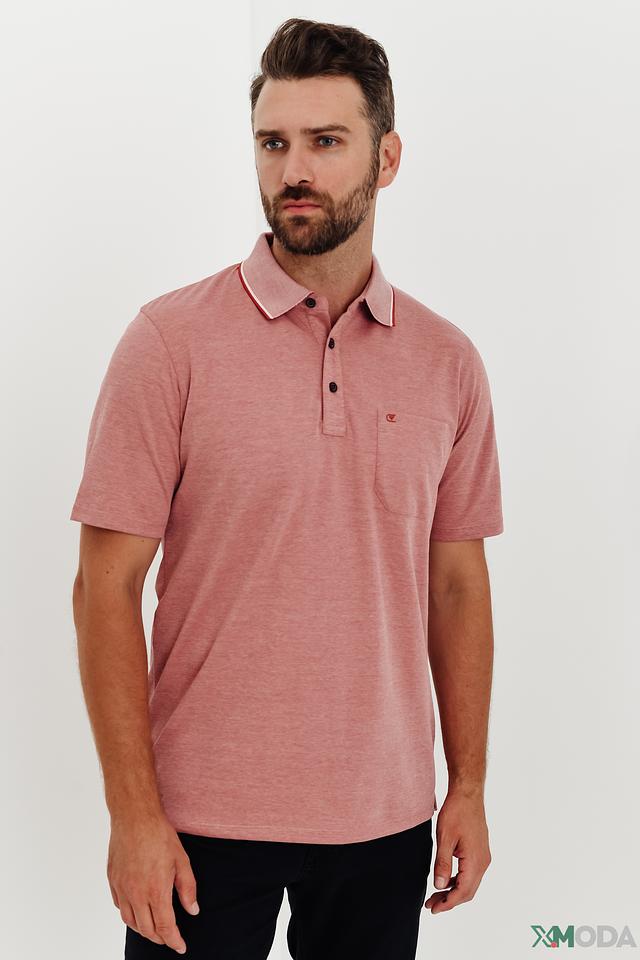 Это мужское поло от бренда Casa Moda выполнено в приятном персиковом цвете. Модель имеет классический крой, короткие рукава и воротник-поло с контрастной белой и красной окантовкой.