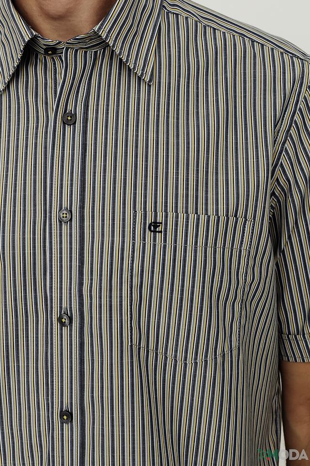 Основной цвет рубашки – синий, дополненный вертикальной полоской белого и желтого цветов. Такое сочетание придает ей свежий и современный вид. Рубашка имеет стандартный воротник и застежку на пуговицы.