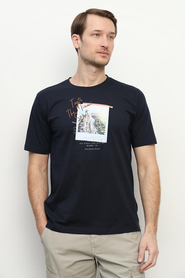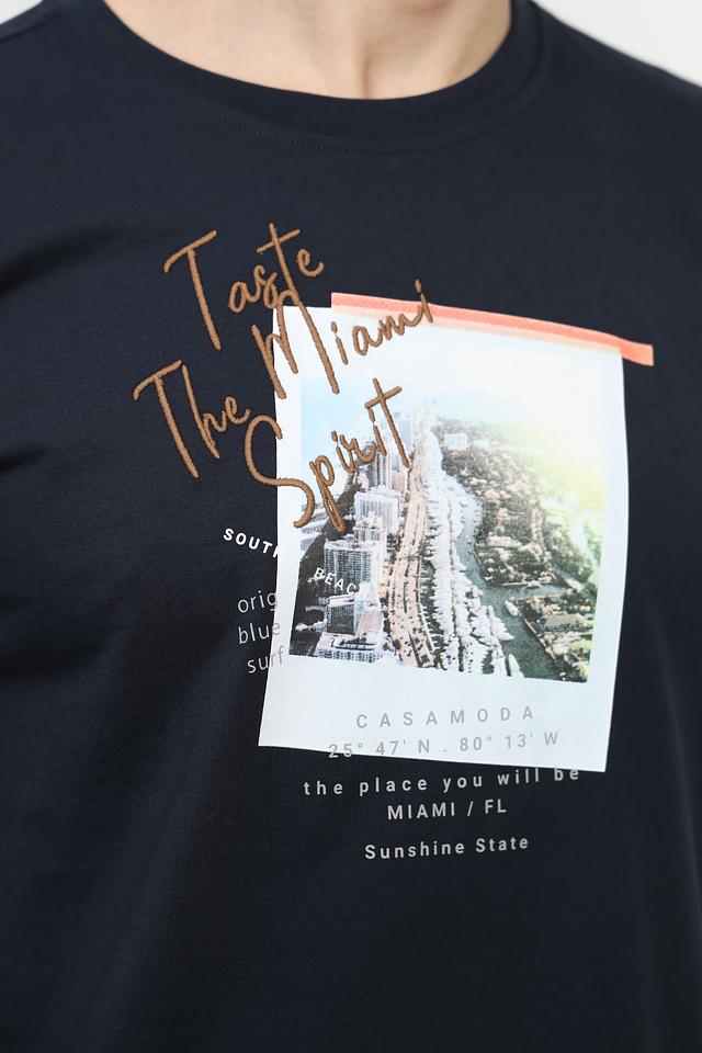 Мужская футболка Casa Moda тёмно-синего цвета с ярким принтом в стиле Miami. Изготовлена из 100% хлопка, обеспечивающего комфорт и воздухопроницаемость. Стильный и удобный выбор для повседневной носки. Состав: хлопок 100%