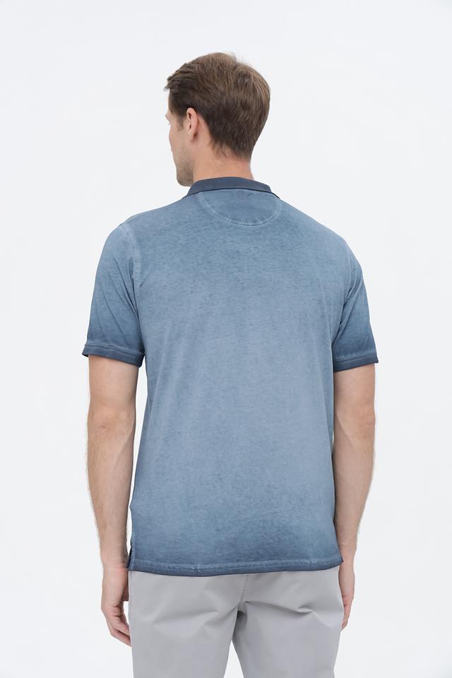 Поло выполнено в голубой цветовой гамме с эффектом легкой выгоревшей ткани, что придает ему стильный и непринужденный вид. Тёмно-синий воротник и манжеты рукавов добавляют контраста и завершают образ.