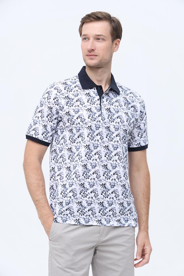 Мужское поло Casa Moda белого цвета с оригинальным цветочным принтом и тёмно-синим воротником и манжетами. Изготовлено из 100% хлопка, обеспечивающего комфорт и воздухопроницаемость. Состав: хлопок 100%