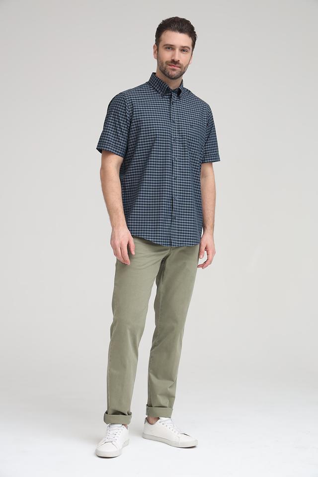 Рубашка имеет короткий рукав и классический крой, обеспечивающий свободу движений и комфорт в жаркую погоду. Воротник рубашки выполнен в классическом стиле, что позволяет сочетать ее с различными типами галстуков или носить без них.