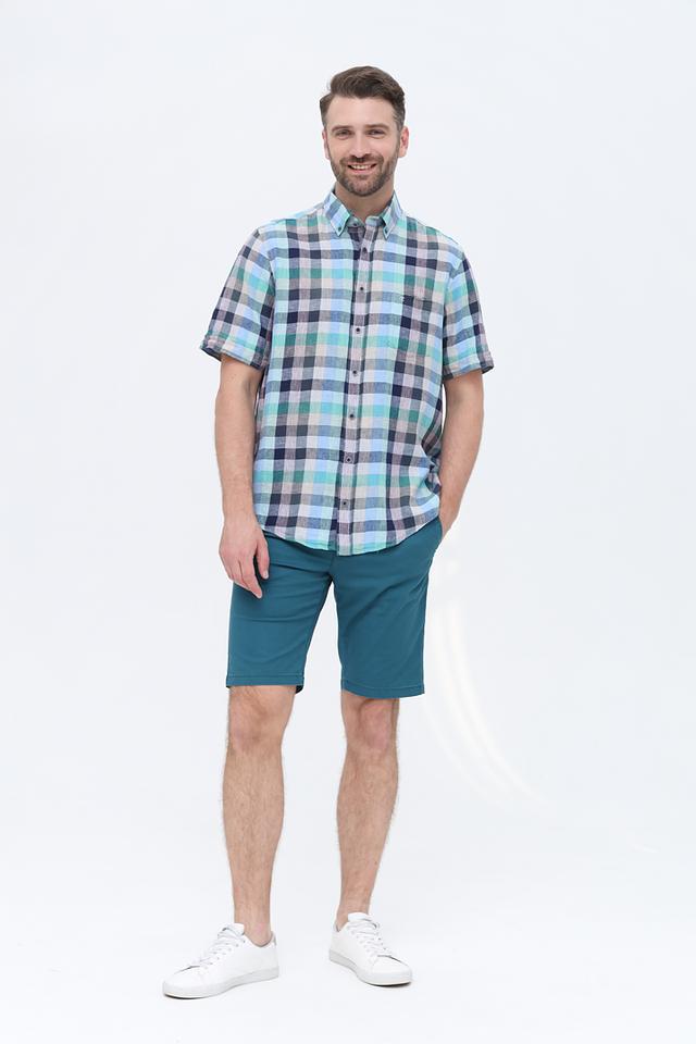 Рубашка имеет классический крой Casual Fit, который обеспечивает свободу движений и подходит для различных типов фигур. Короткие рукава делают ее идеальной для теплой погоды. Дизайн рубашки дополнен яркой клеткой, состоящей из различных оттенков зеленого, голубого и коричневого, что придает ей оригинальность и выразительность.