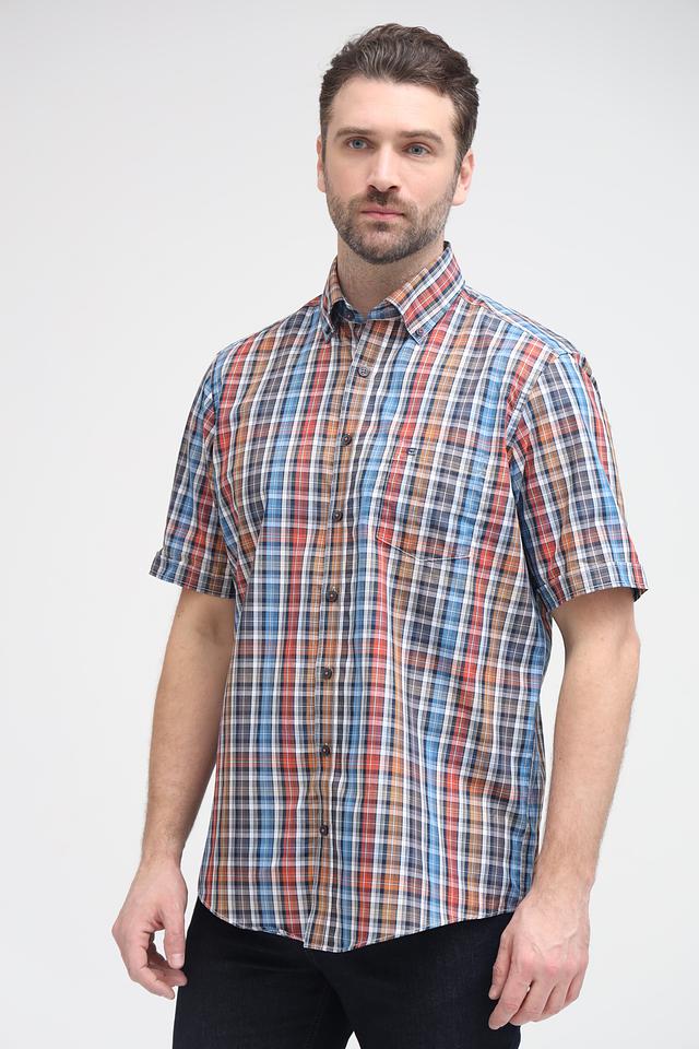 Рубашка имеет классический крой с короткими рукавами и стандартным воротником. Яркий клетчатый принт в сочетании оранжевого, синего, коричневого и белого цветов делает эту рубашку заметной и привлекательной.