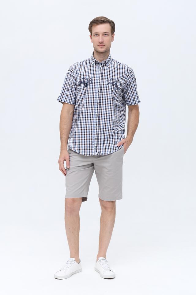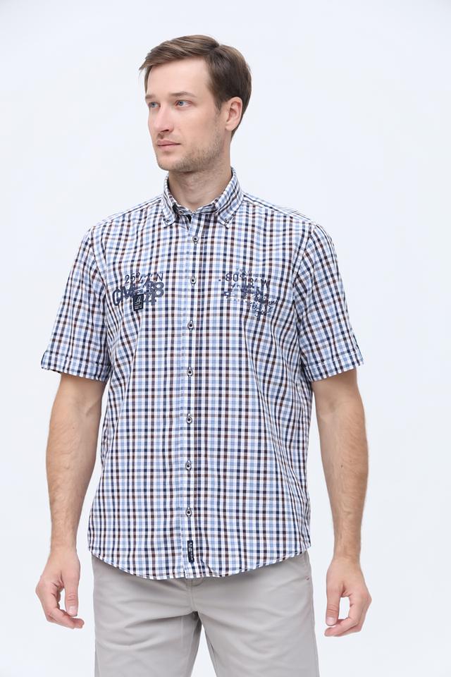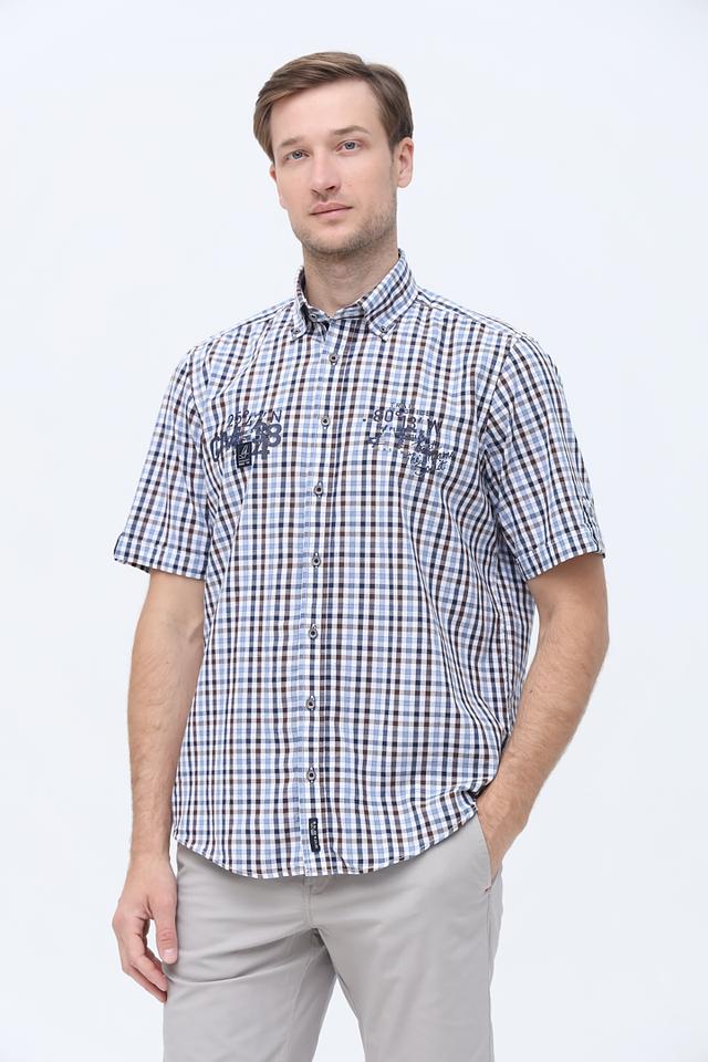 Мужская рубашка Casa Moda голубо-коричневой расцветки с коротким рукавом, выполнена в клетку и украшена вышивкой. Изготовлена из 100% хлопка, обеспечивающего комфорт в жаркую погоду. Состав: хлопок 100%