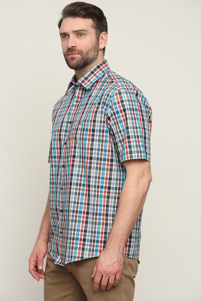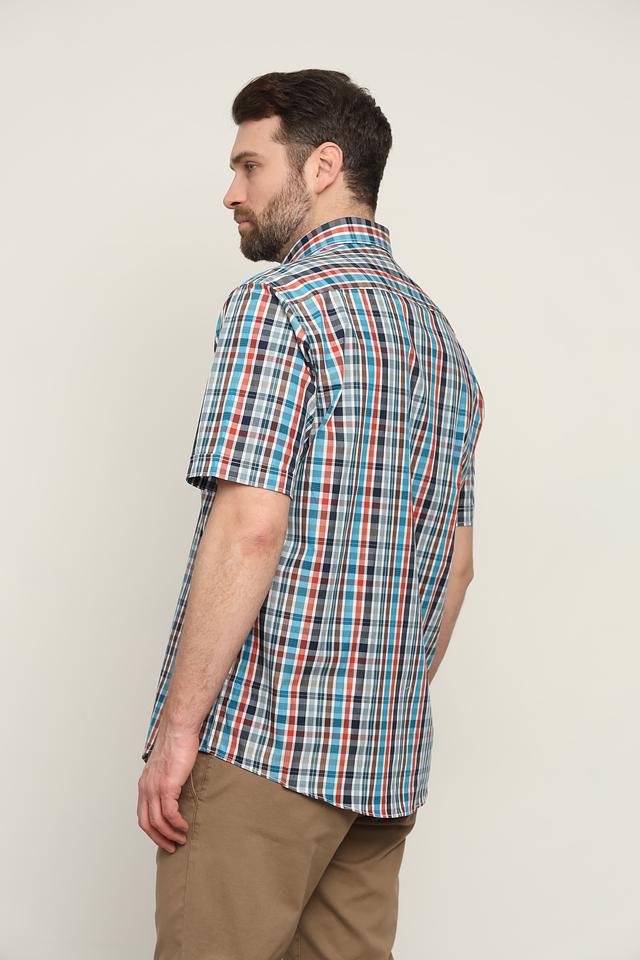 Рубашка имеет классический крой с короткими рукавами и стандартным воротником. Яркий клетчатый принт, выполненный в сочетании синих, оранжевых и серых оттенков, делает эту модель заметной и стильной.