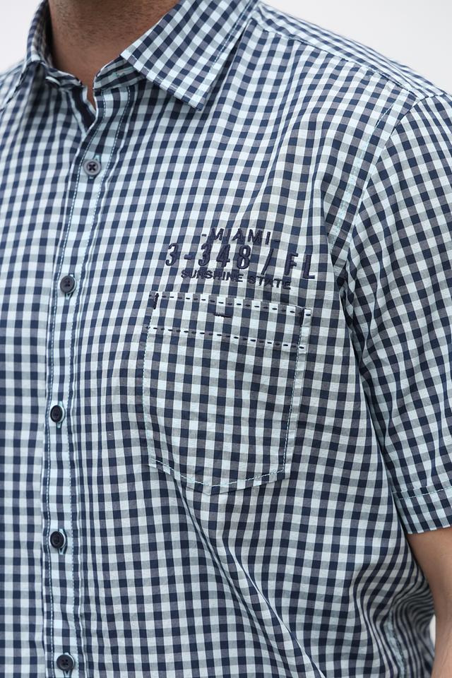 Особенностью данной модели является стильная клетка синего и белого цветов, а также декоративный нагрудный карман с вышивкой. Эта рубашка легко сочетается с джинсами, шортами или брюками, создавая непринужденный и современный образ.