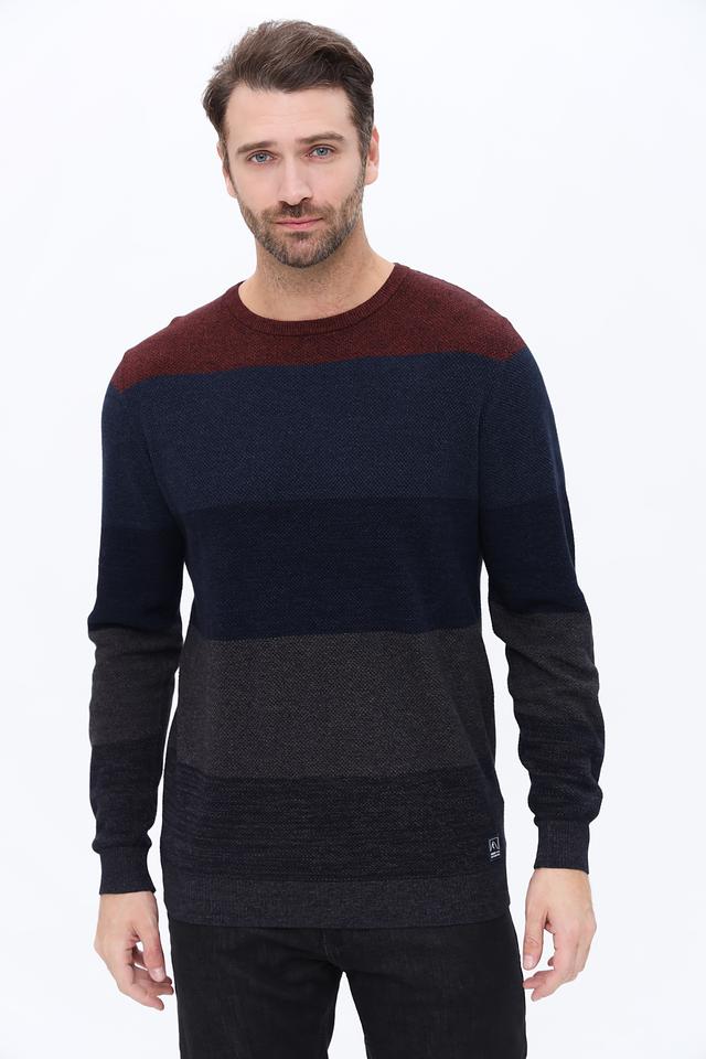 Джемпер имеет оригинальный дизайн с горизонтальными полосами бордового, темно-синего и серого цветов. Классический круглый вырез горловины и длинные рукава делают его универсальным для различных образов.